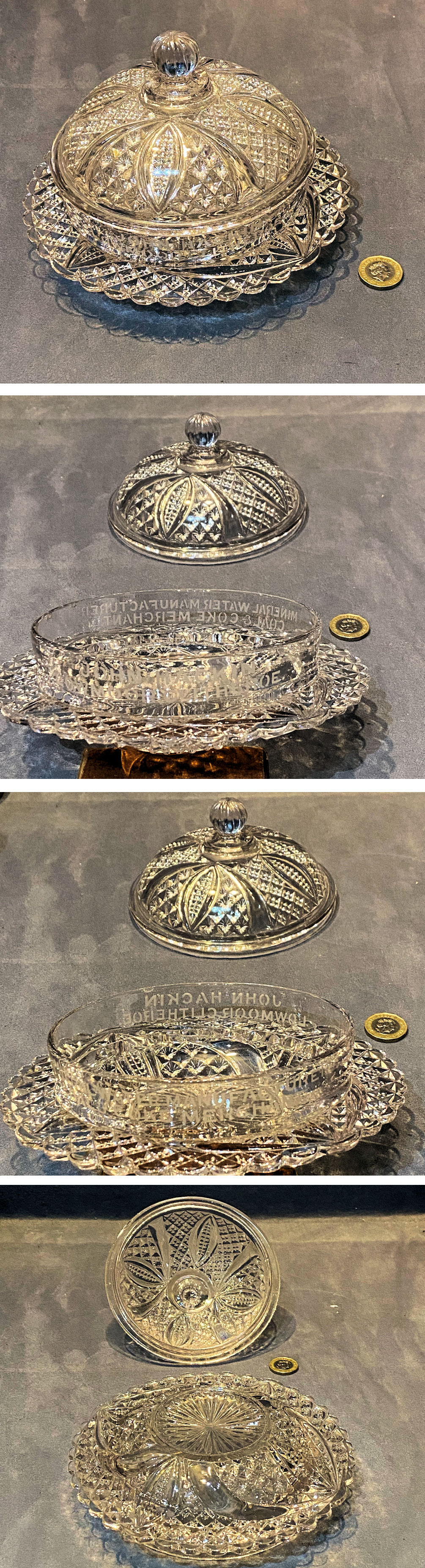 Mineral Water Manufacturer Glass Butter Dish A207 Original, quality 1920's moulded clear glass butter dish with lid, of good proportions. This perfect and delightful glass butter dish has another surprise, the base is acid etched to the sides for the "Mineral Water Manufacturer & Coal & Coke Merchant, John Hackin, Lowmoor Clitheroe". This is the first we have seen. Some bubbles to the top rim of the base, but no chips or cracks and complete and in good and working order.
