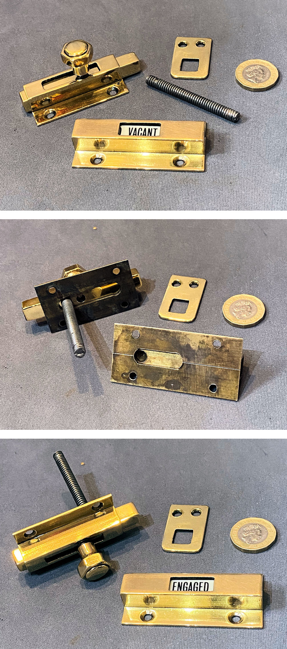 Brass Vacant / Engaged Toilet Door Bolt, 4 available LL100 Original, quality 1930's cast brass bathroom door bolt with Vacant & Engaged panels which appear on the outside of the door when the bolt inside is drawn across to secure. Stamped to the reverse with the registration number for the year 1937. Polished and lacquered, although the lacquer may be removed at no extra cost and complete and in good and working order.