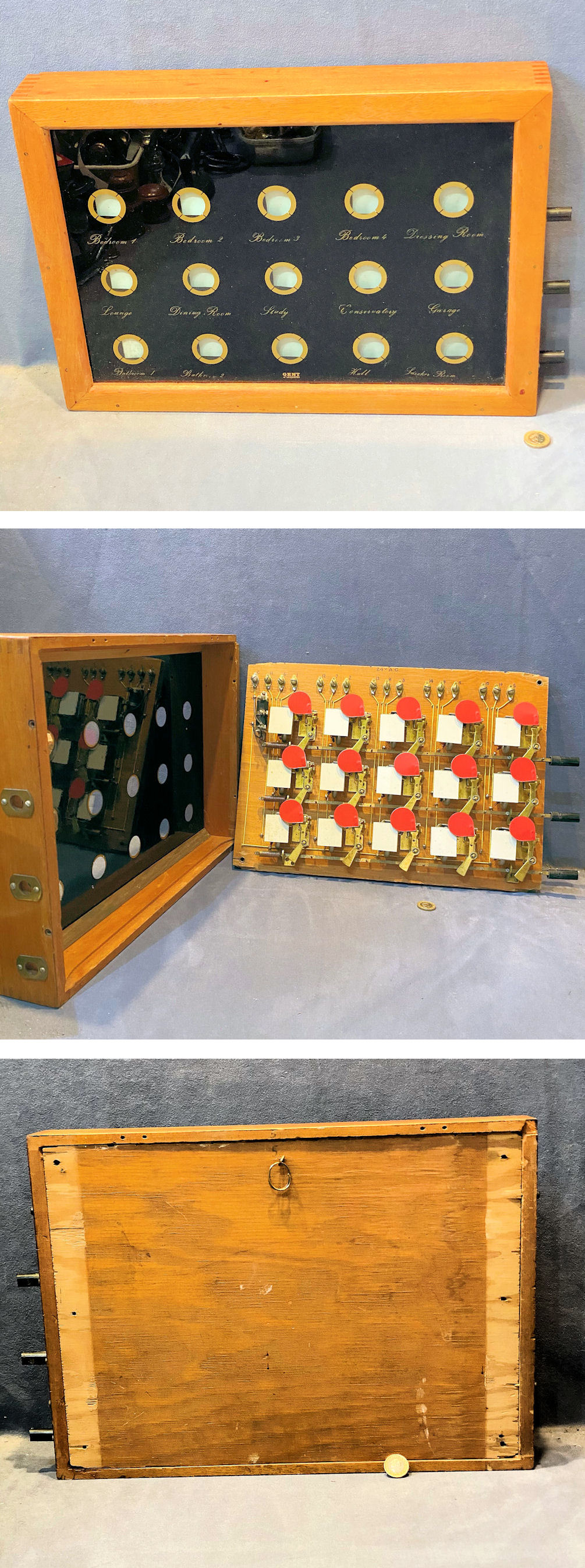 Electric Indicator Board IB336 Original, quality 1920's / 30's electric indicator board in a teak cabinet with fifteen windows on a black glazed panel. For use with a 12-volt, low-voltage electric supply system. Other parts required to operate this system are usually available in stock. Each circular window is detailed beneath with the room name or number, "Bedroom 1,2,3 & 4", "Dressing Room", "Lounge", "Dining Room", "Study", "Conservatory", "Garage", "Bathrooms 1&2", "Hall", "Snooker Room" and also "Gent of Leicester" for the manufacturer. Fully overhauled and is complete and in good and working order.