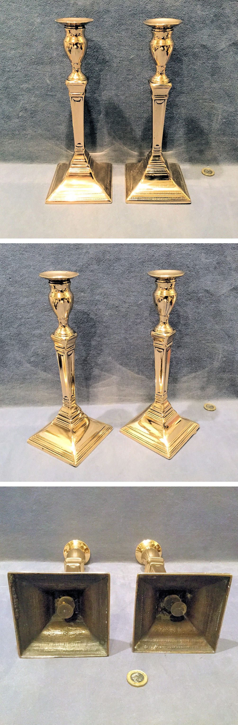 Pair of Square Brass Candlesticks CS216 Original, quality pair of matching early 19th century pink cast brass candlesticks with tapered square stems on square pyramidal shaped bases. This pair have the original push rod candle ejectors, are complete and in good and working order and have been polished and lacquered, although the lacquer may be removed at no extra cost. An unusual design.