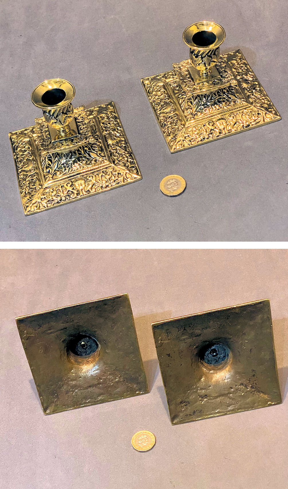 Pair of Queen of Diamonds Brass Candlesticks CS152 Pair of original, quality, late 19th century, cast brass candlesticks with square bases and canted corners and shaped stems. This pair of candlesticks are complete with the push ejector rods for the candles and are impressed to the plinth "The Queen of Diamonds". All has been polished and lacquered, although the lacquer may be removed at no extra cost and are complete and in good and working order.