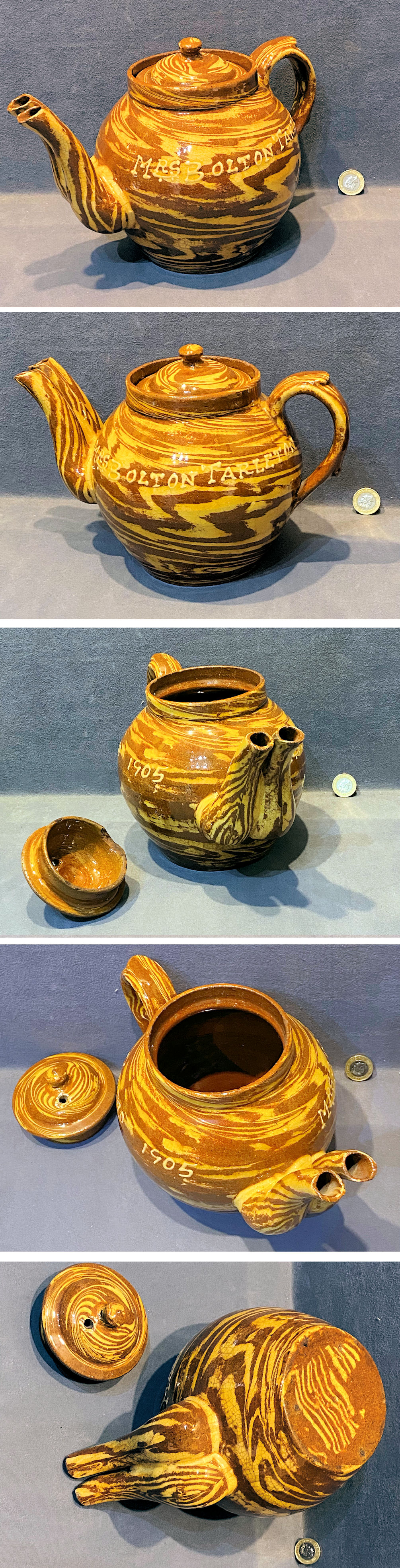 Twin Spout Slipware Teapot TP48 Original, quality most unusual slipware teapot with twin spouts, fully slip decorated overall, including the underside and with underglaze detail for "Mrs Bolton Tarleton, May 10 1905". This super example is generally in good order and usable if you wish, but it does have a chip on the inside rim of the lid, otherwise, all is complete and in good and working order.