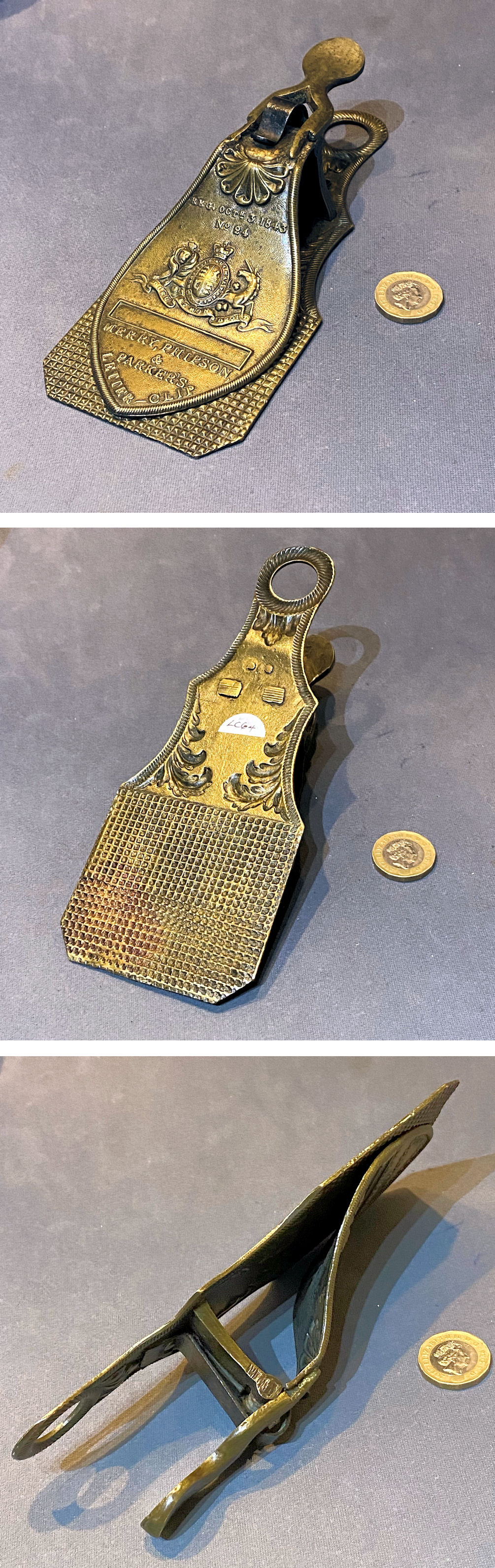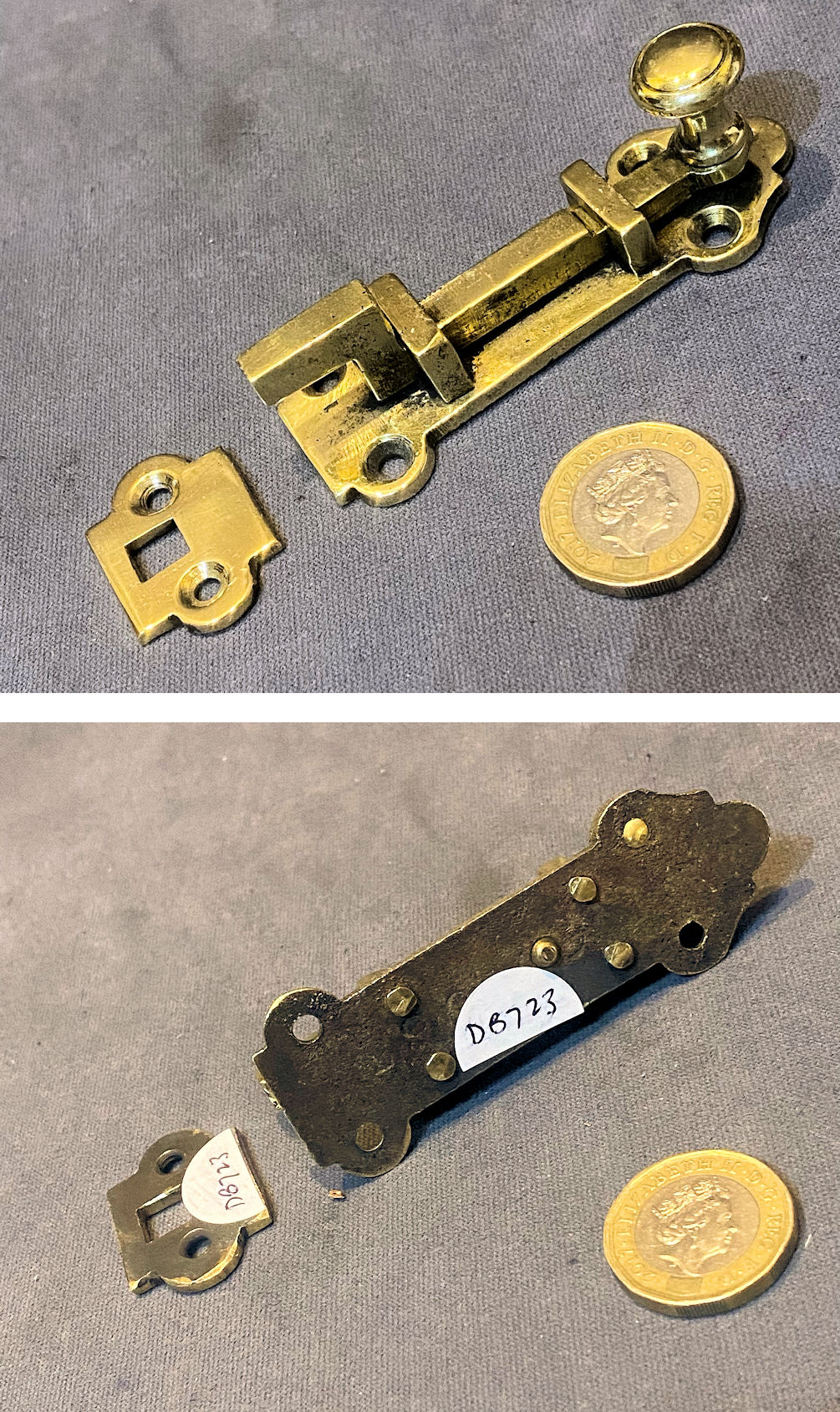 2.5" Brass Cupboard Door Bolt DB724 Original, quality late 19th century decorative cast brass cupboard door bolt of a most unusual design and in the original two tone matt gilt finish. Both the backplate and the keep have three countersunk screw holes for mounting each. Complete in good and working order.