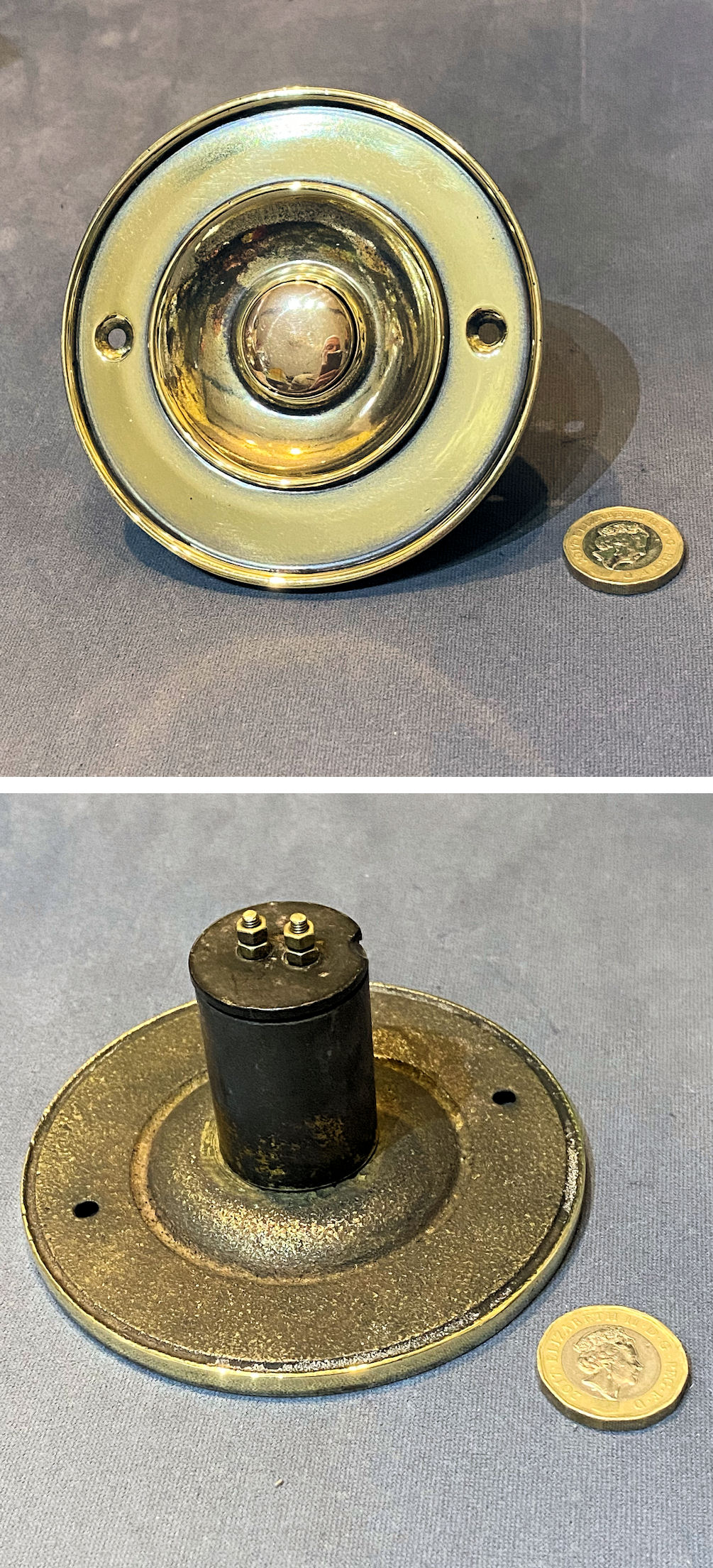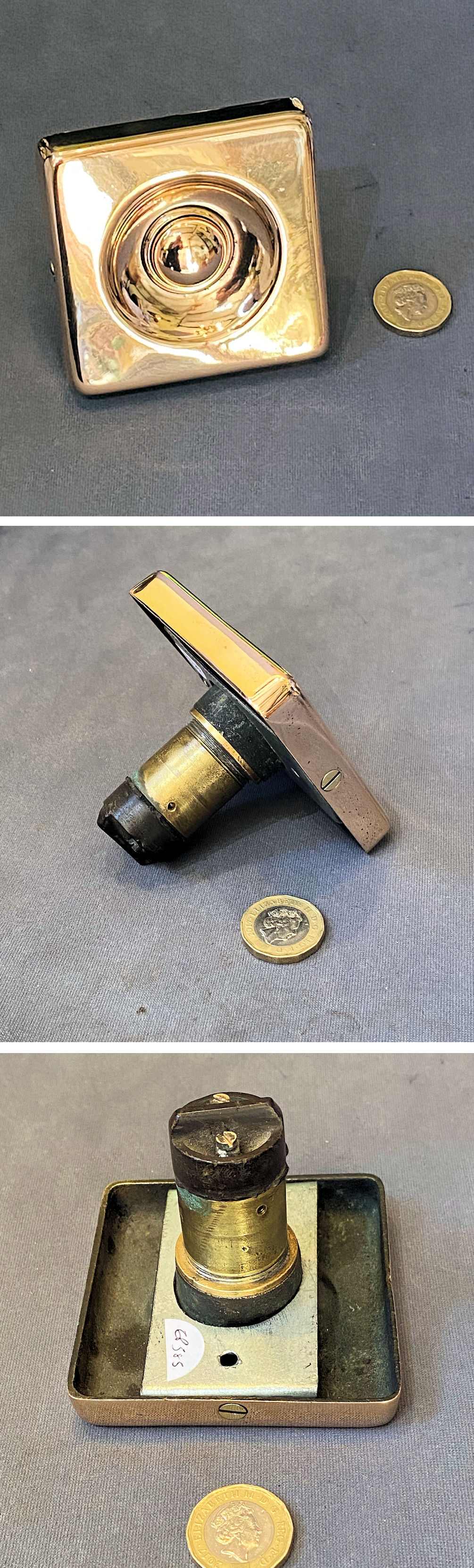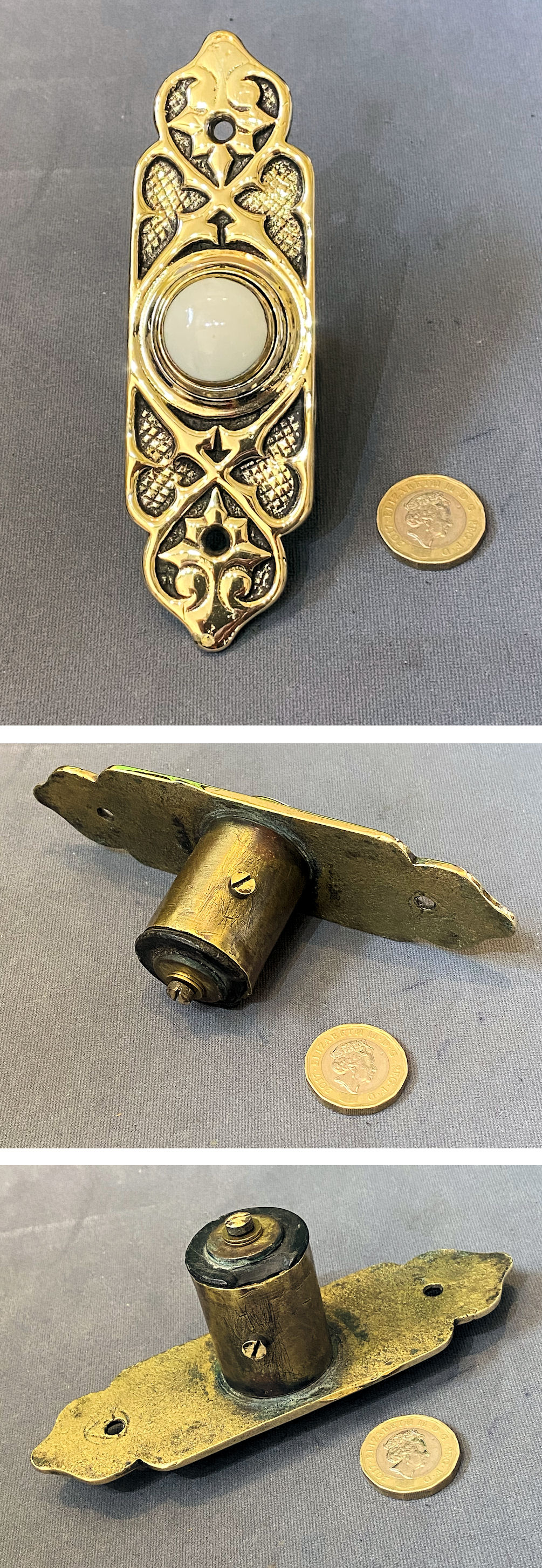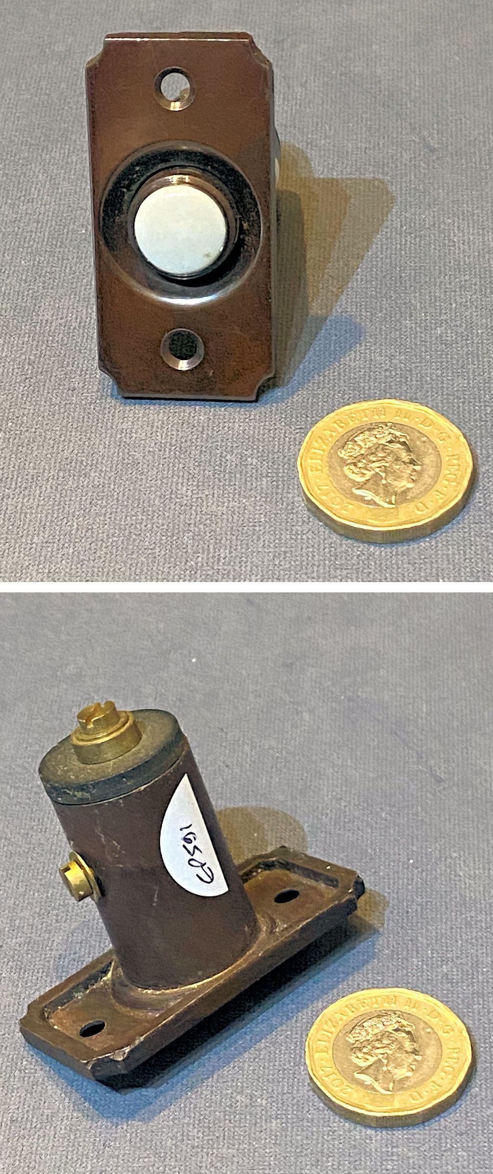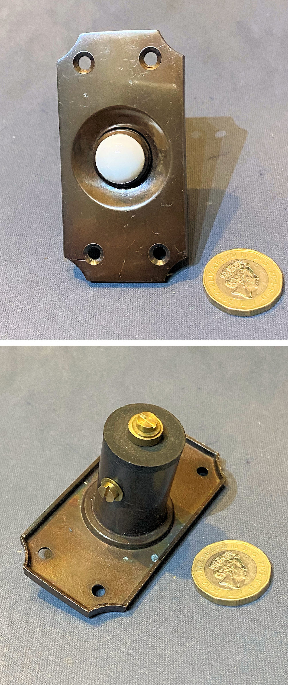 Unused Brass Exterior Electric Bell Push, 2 available EP590 Original, quality 1930's unused vertical exterior electric bell push. This very clean example has the original bronze finish, a white ceramic push button to the centre, canted corners and four countersunk screw holes for mounting. For use with a 12-volt, low-voltage electric supply system. Other parts required to operate this system are usually available in stock. Fully overhauled and complete and in good and working order.