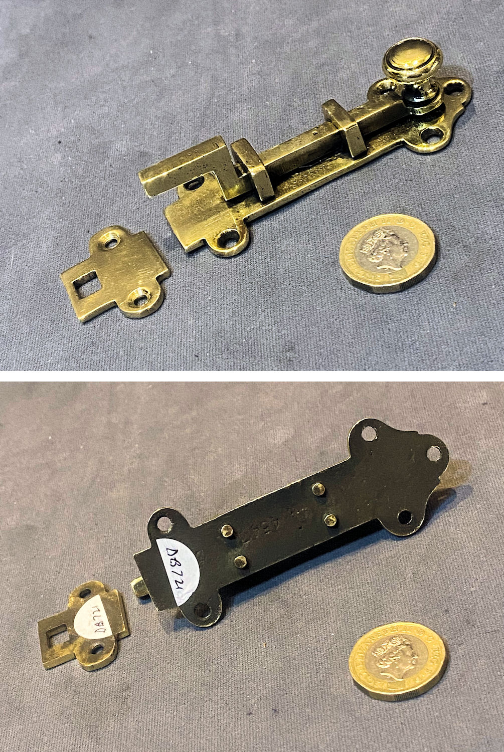 3.5" Brass Cupboard Door Bolt DB721 Original, quality late 19th century small cast brass cranked surface mounted cupbaord door bolt with a replacement keep plate made to suit and a spherical knob / grip. The backplate has five countersunk screw holes for mounting, and the keep plate has two. All has been polished and lacquered, although the lacquer may be removed at no extra cost and is complete and in good and working order.