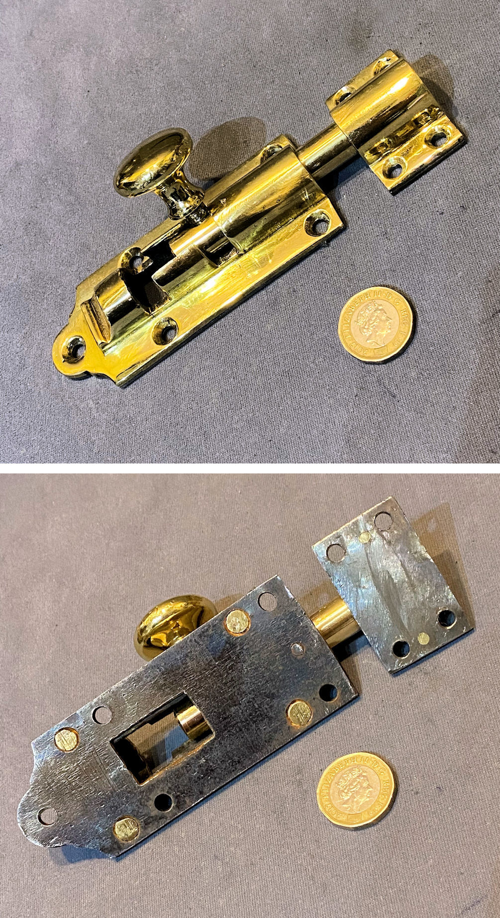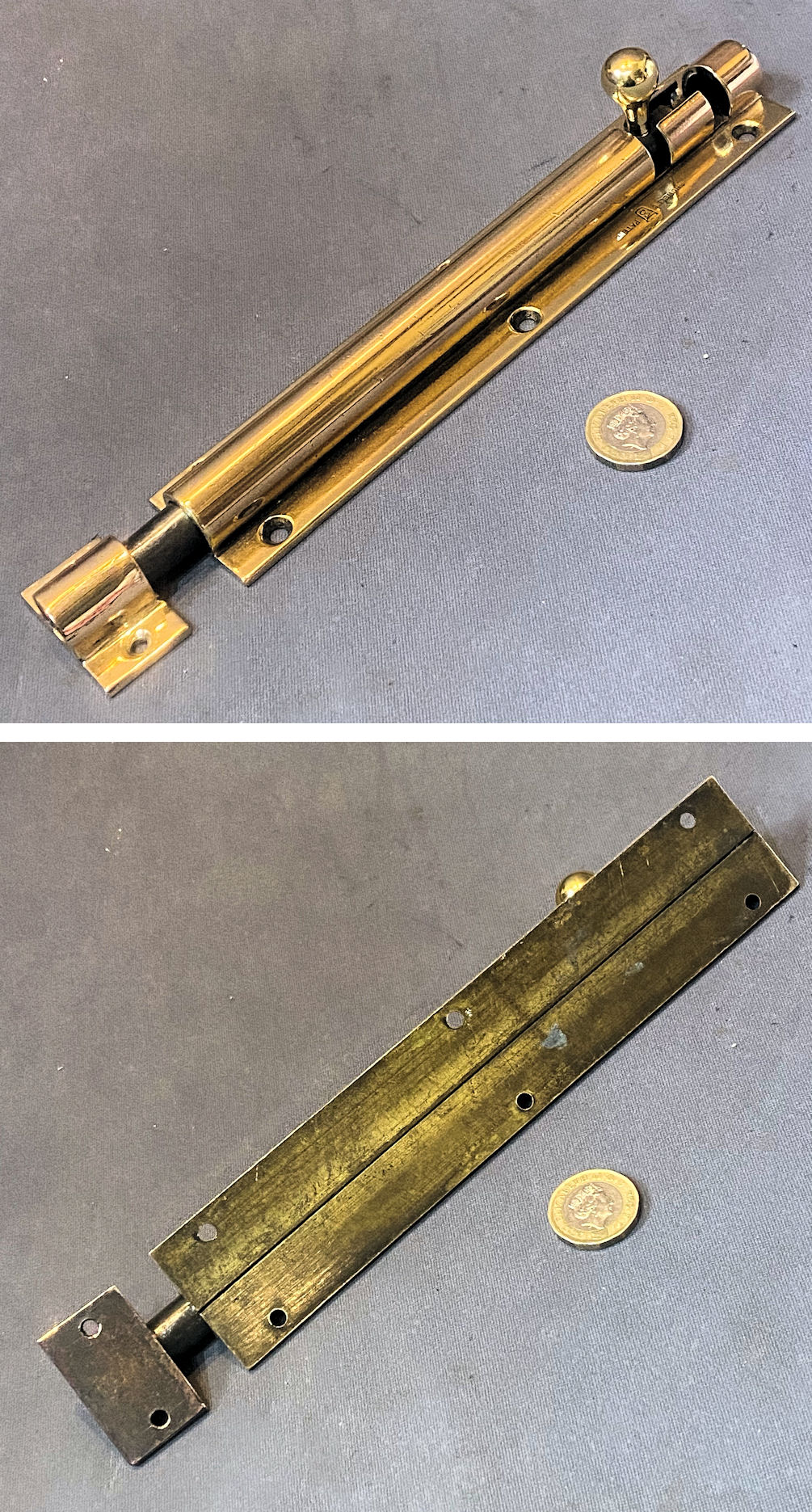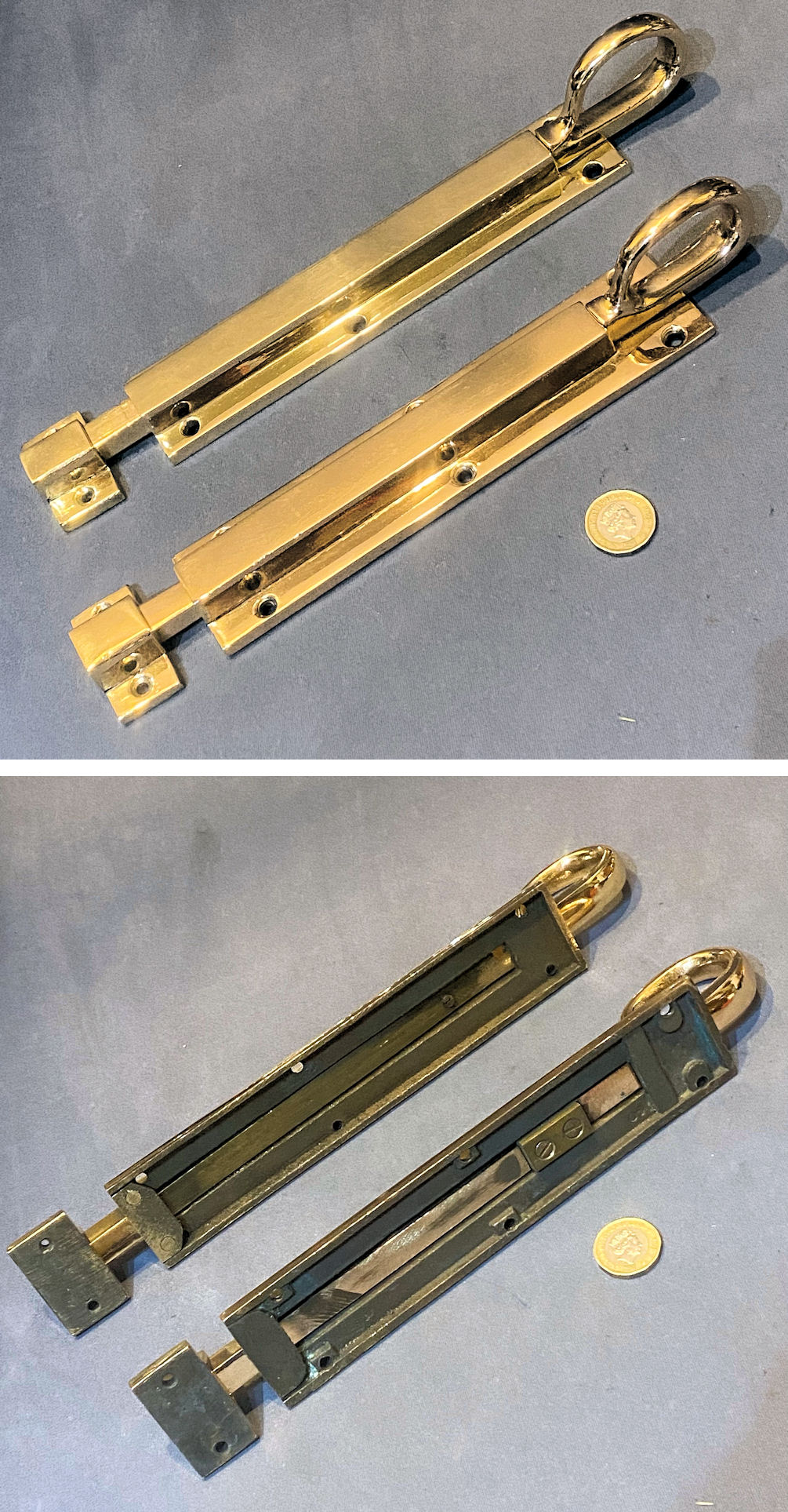 Near Pair of 9 1/8" Brass Door Bolts DB717 Original, quality near pair of cast pink brass 1920's surface mounted door bolts with loop grips to the square bolt bars and replacement brass keeps made to suit. The bolt backplates each have six countersunk screw holes for mounting, and the keeps have two each. These bolts have a strong internal spring to hold the adjustment tight. All has been polished and lacquered, although the lacquer may be removed at no extra cost. Fully overhauled and is complete and in good and working order.
