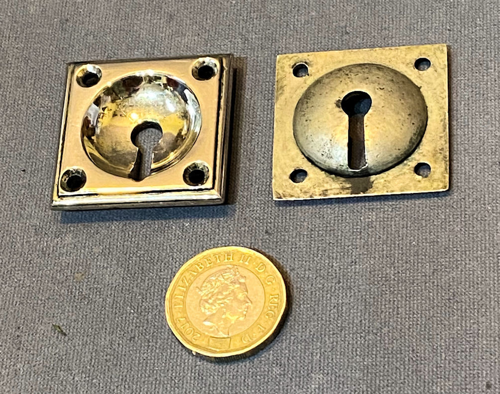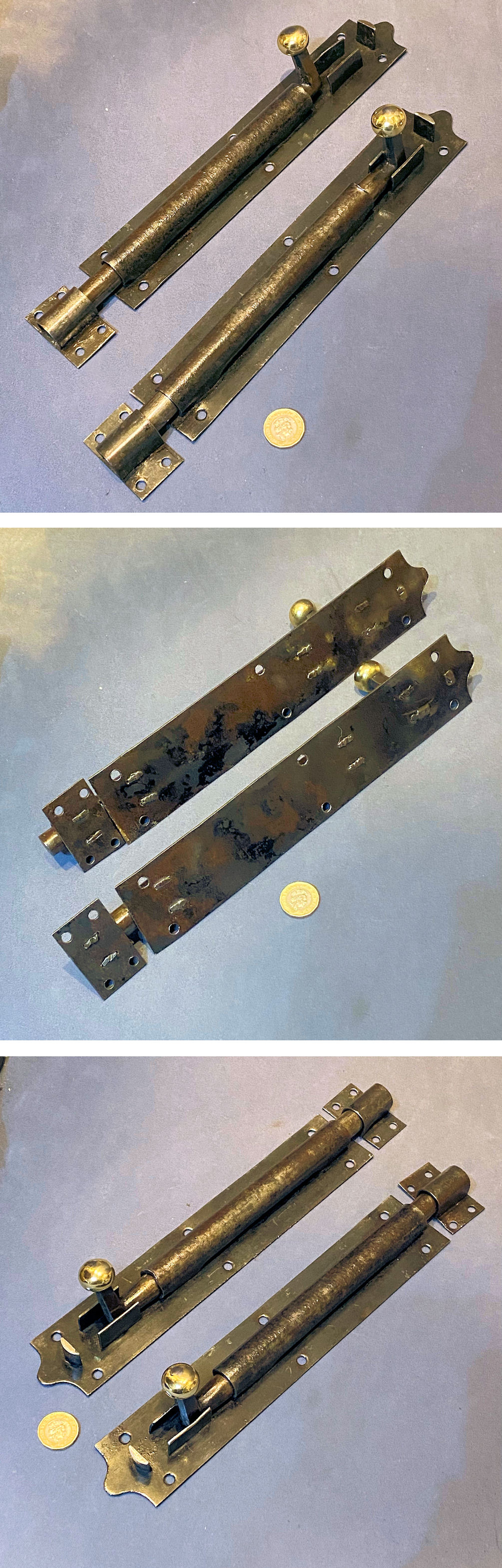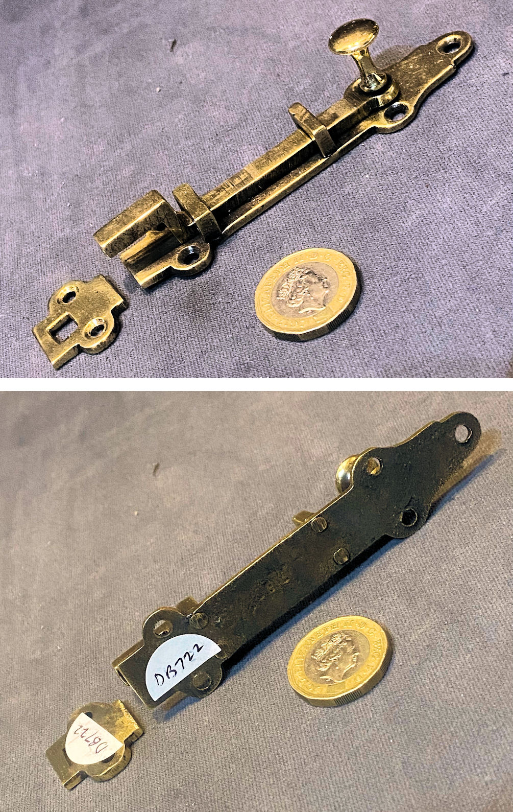 Near Pair of 9 1/8" Brass Door Bolts DB717 Original, quality near pair of cast pink brass 1920's surface mounted door bolts with loop grips to the square bolt bars and replacement brass keeps made to suit. The bolt backplates each have six countersunk screw holes for mounting, and the keeps have two each. These bolts have a strong internal spring to hold the adjustment tight. All has been polished and lacquered, although the lacquer may be removed at no extra cost. Fully overhauled and is complete and in good and working order.