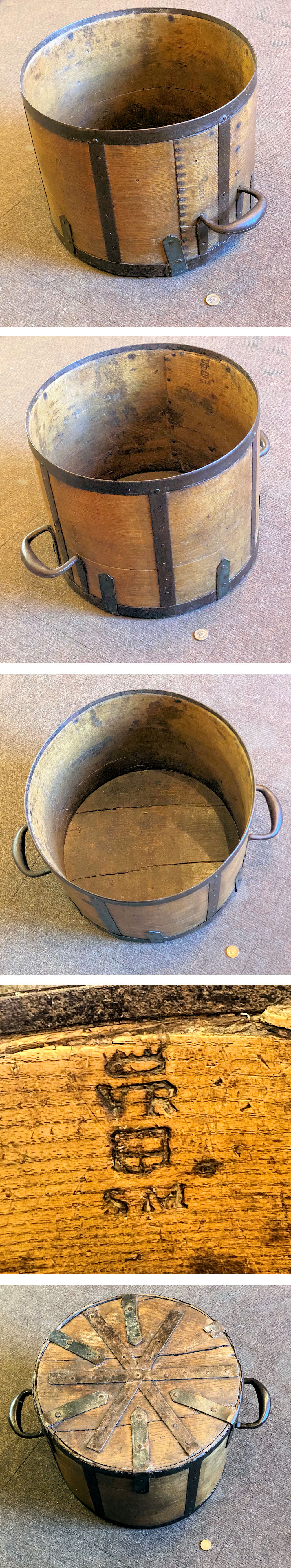 Bentwood Bushel Measure M316 Original, quality late 19th century Bentwood Bushel Corn Measure with blacksmith made side handles and straps and top rim. The inner wall is branded "V.R" and other details relating to the reign of Queen Victoria, and the outside is branded twice for "Bushel", the capacity. Some shrinkage to the wooden floor, but otherwise complete.