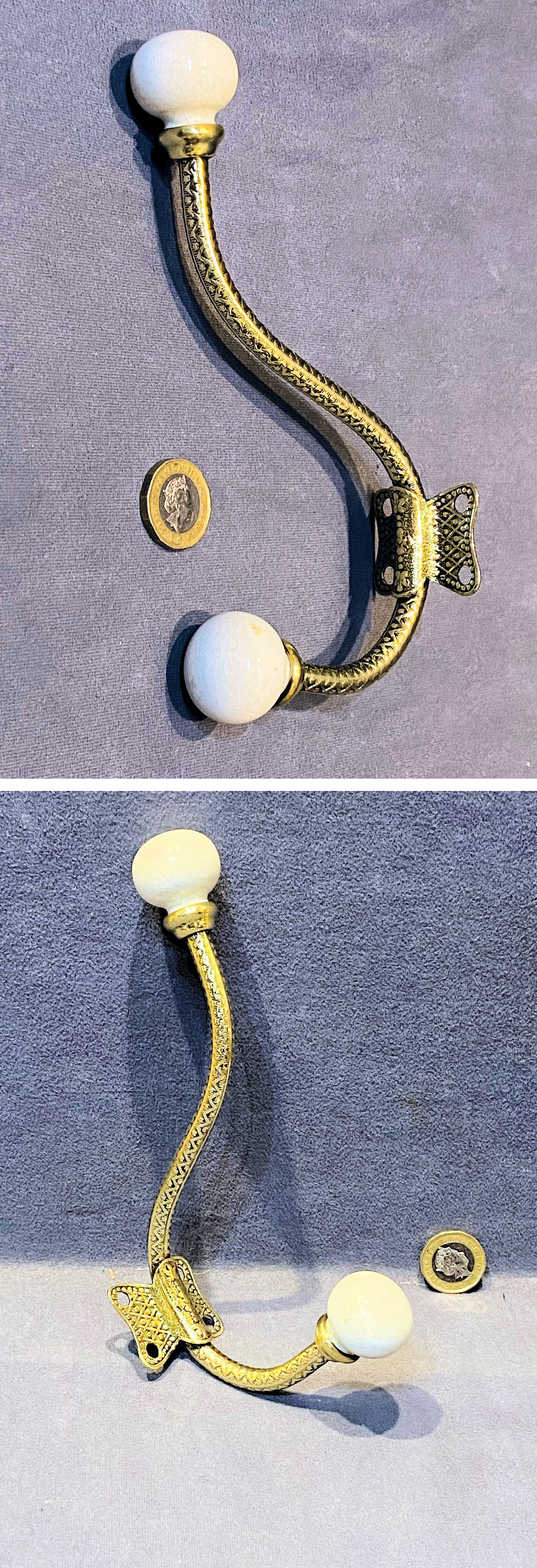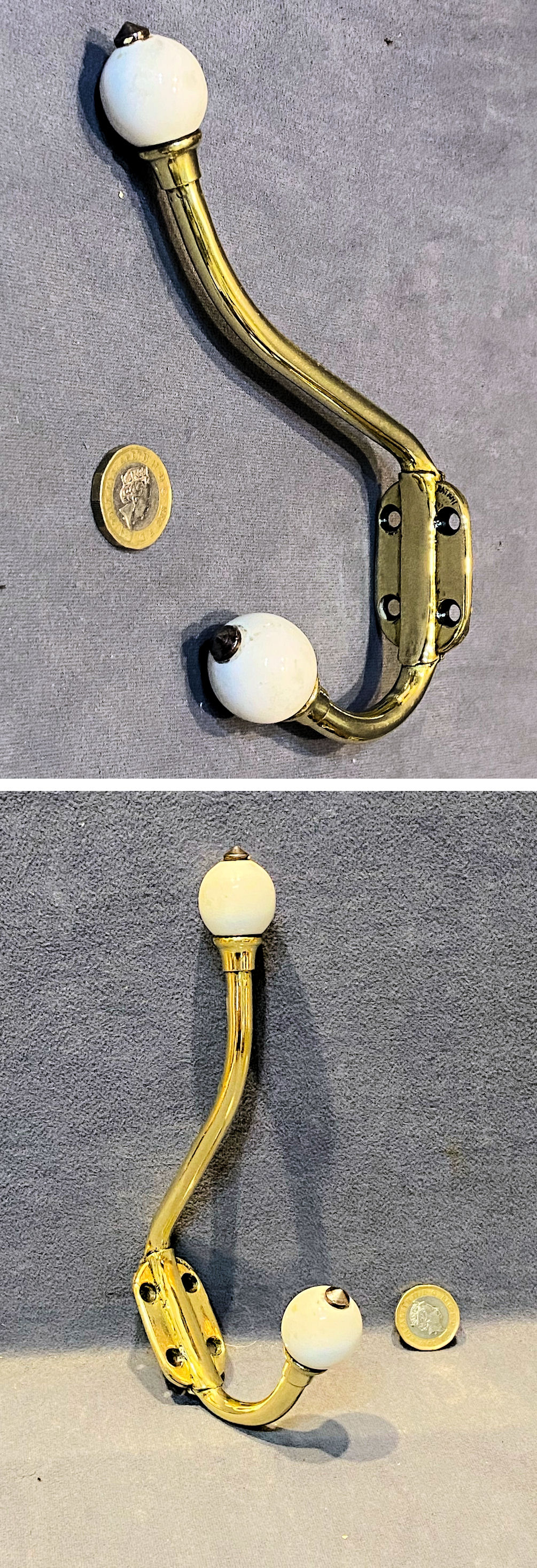 Brass & Ceramic Hat or Coat Hook, 5 matching available CH123 Original, quality late 19th century brass hat or coat hooks with a decorated stem, a cast brass backplate with two countersunk screw holes for mounting and a white ceramic finial. All has been polished and lacquered, although the lacquer may be removed at no extra cost and all are complete and in good and working order.
