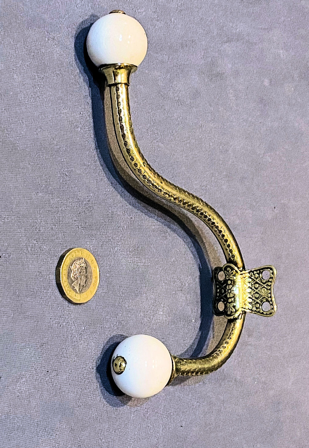 Brass & Ceramic Hat & Coat Hook CH129 Original, quality late 19th century brass hat and coat hook with a decorated stem mounted to a brass backplate with four screw holes for mounting and with spherical white ceramic finials. All has been polished and lacquered, although the lacquer may be removed at no extra cost and is complete and in good and working order.