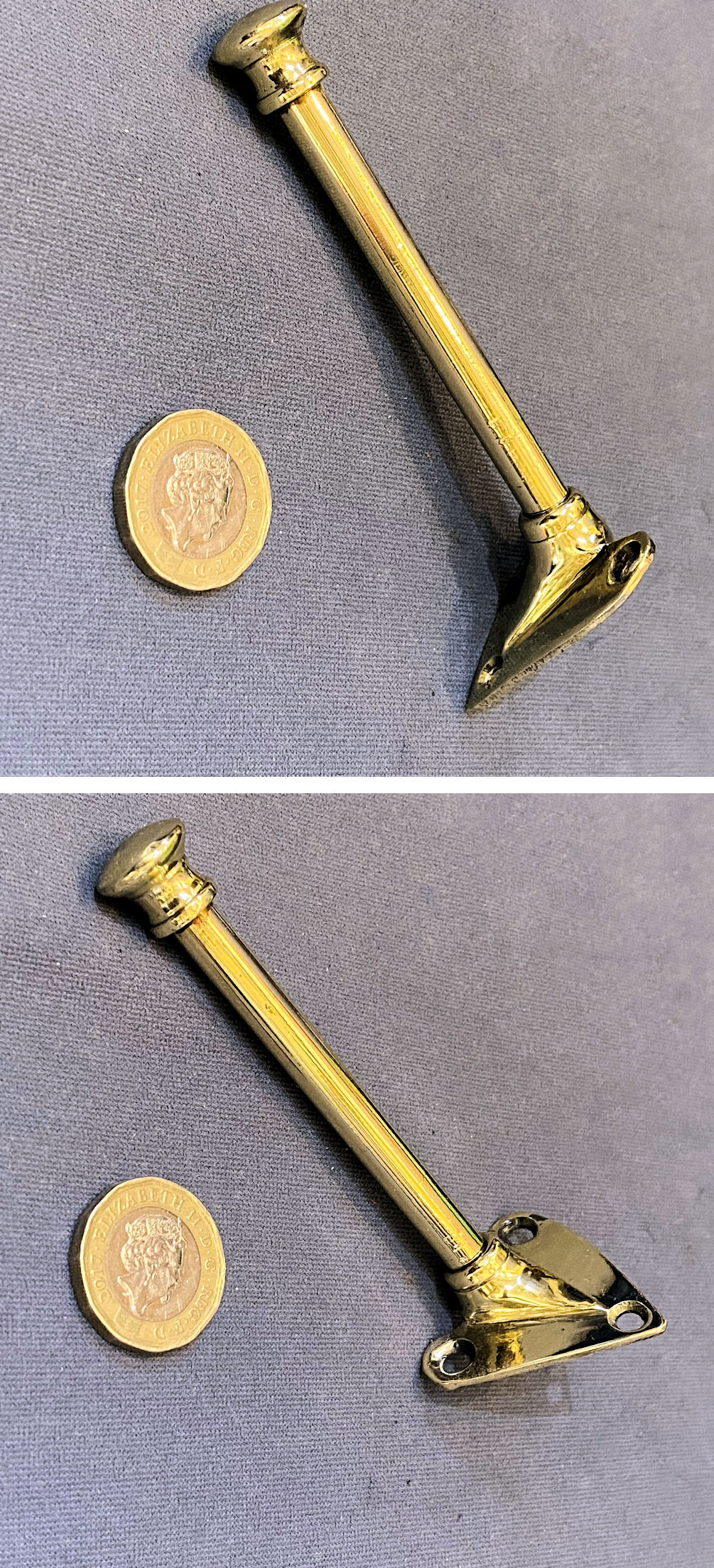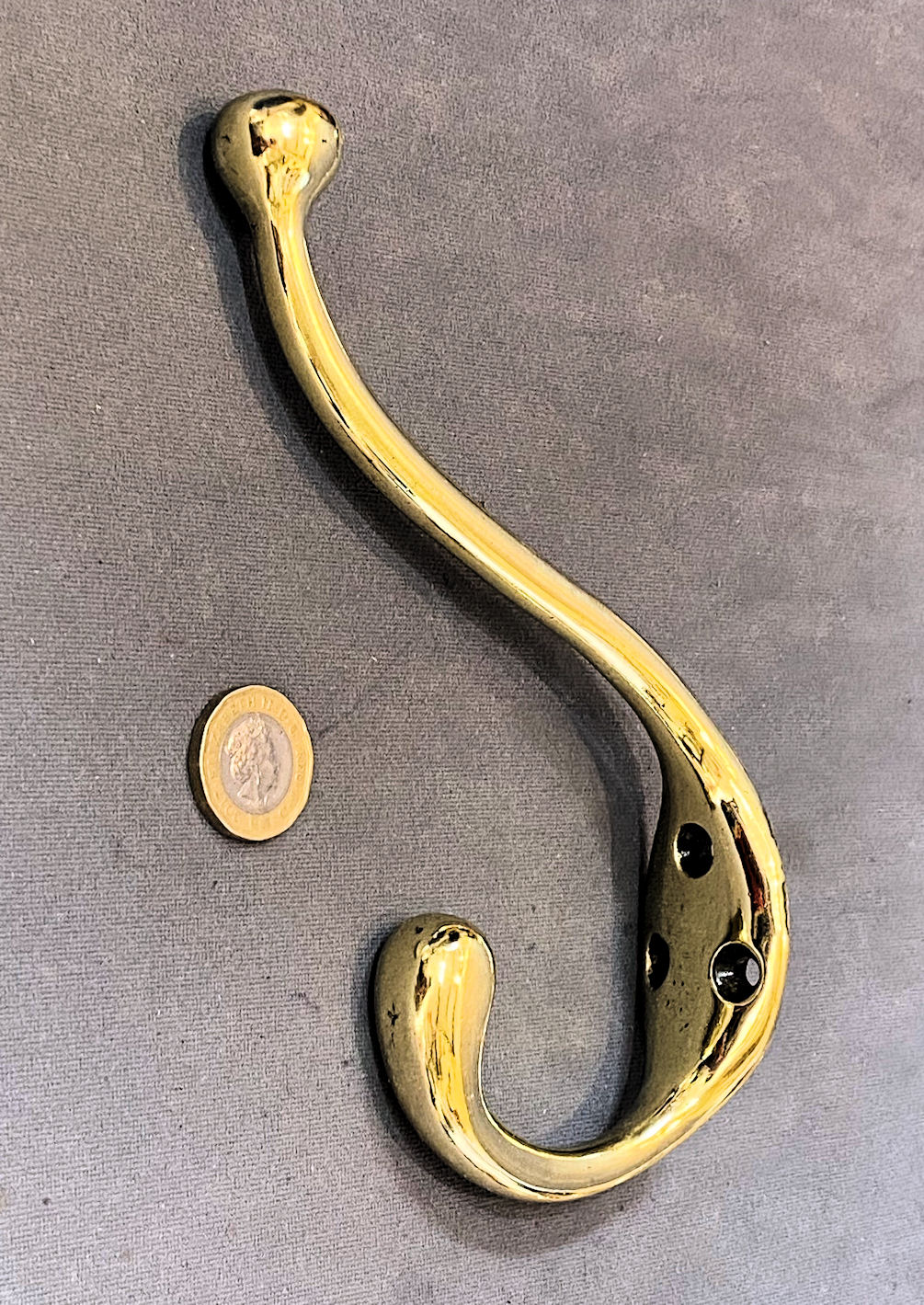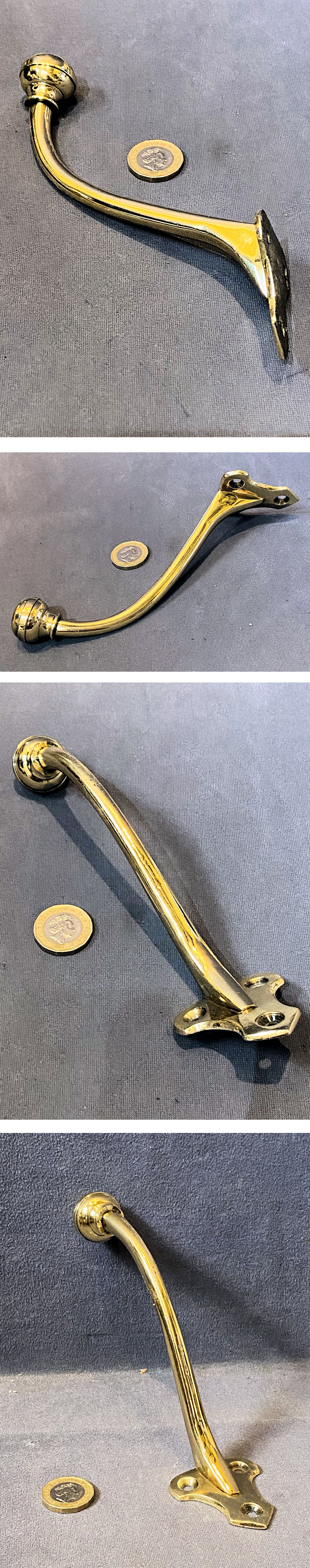 Brass Coat or Hat Peg CH156 Original, quality late 19th century wall mounted all brass hat or coat peg. This clear example has a heart shaped backplate with three countersunk screw holes and a plain tubular stem with a shaped finial to the top. All has been polished and lacquered, although the lacquer may be removed at no extra cost and is complete and in good and working order.
