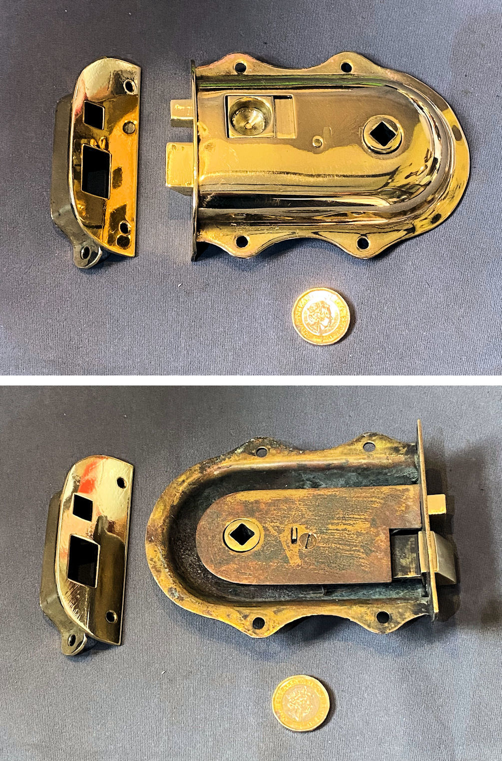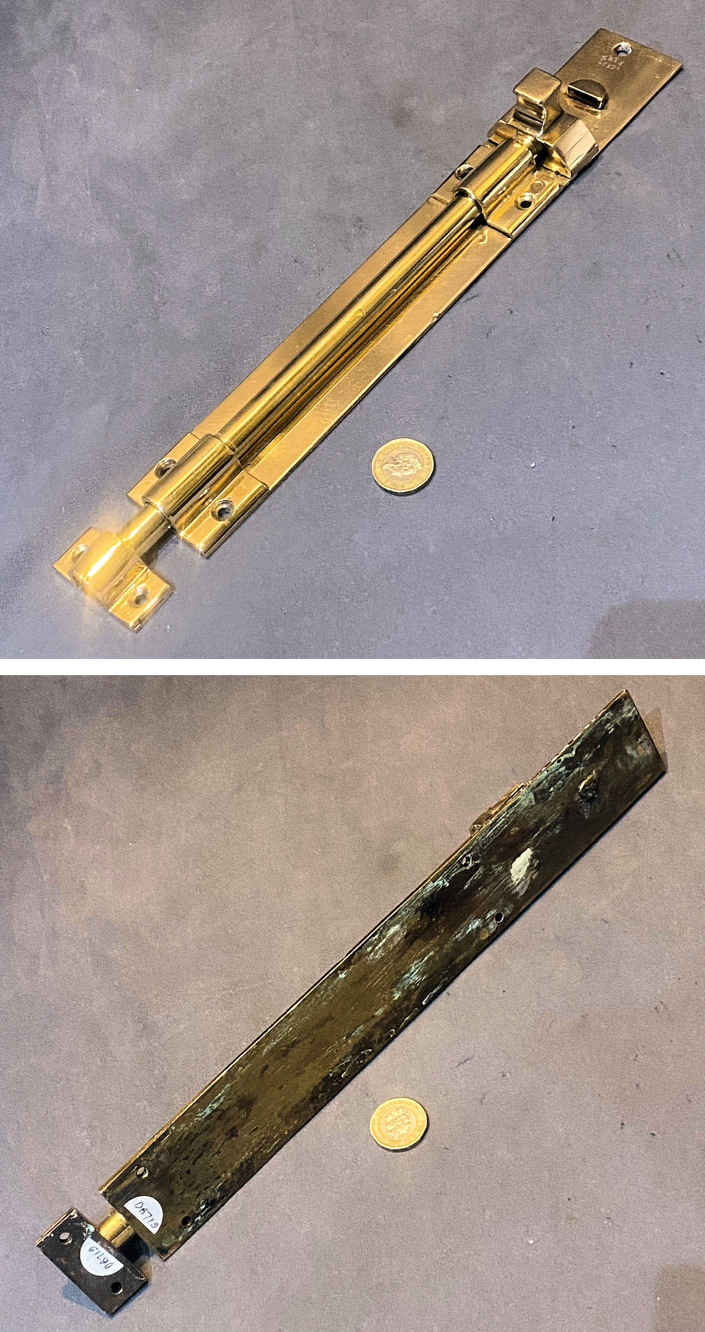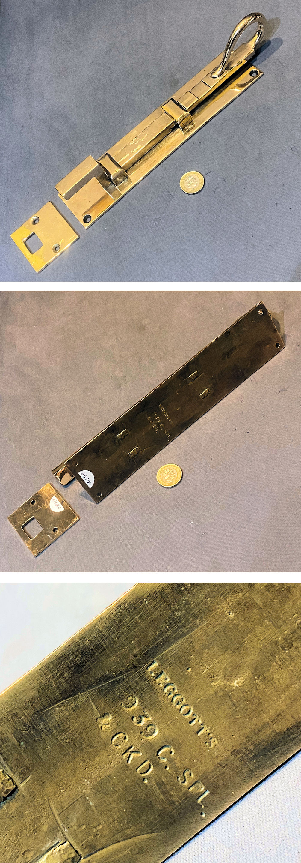 Pair of 12" Recessed Brass Door Bolt DB720 Original, quality pair of 12" cast pink brass recessed door bolts of the highest quality. The reverse is impressed "E.T & S" for the manufacturer and registration number for the year 1912. Replacement keeps have been made to suit. The backplates each have four countersunk screw holes for mounting, the tops have two each, and the keeps also have two each. The well sprung lever action is a treat and works very well, and has been fully overhauled. Polished and lacquered, although the lacquer may be removed at no extra cost and are complete and in good and working order.