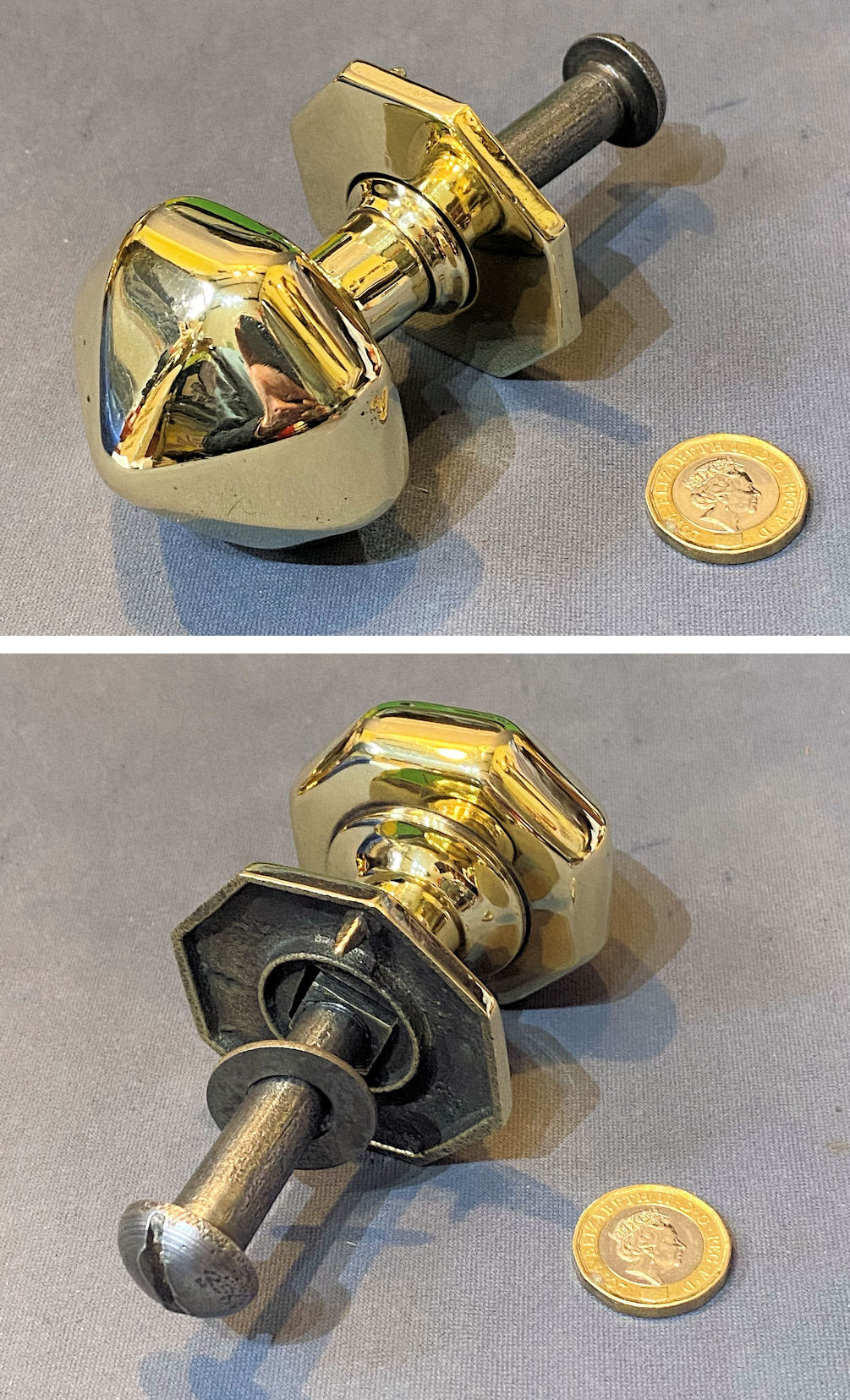Brass Door Pull Knob DP651 Original, quality late 19th century octagonal shaped cast brass door pull knob with the original matching backplate and threaded wrought iron bolt with a domed heads, smaller than average for this shape. This handle will not turn a lock or latch, only pull the door closed. Complete and in good and working order.