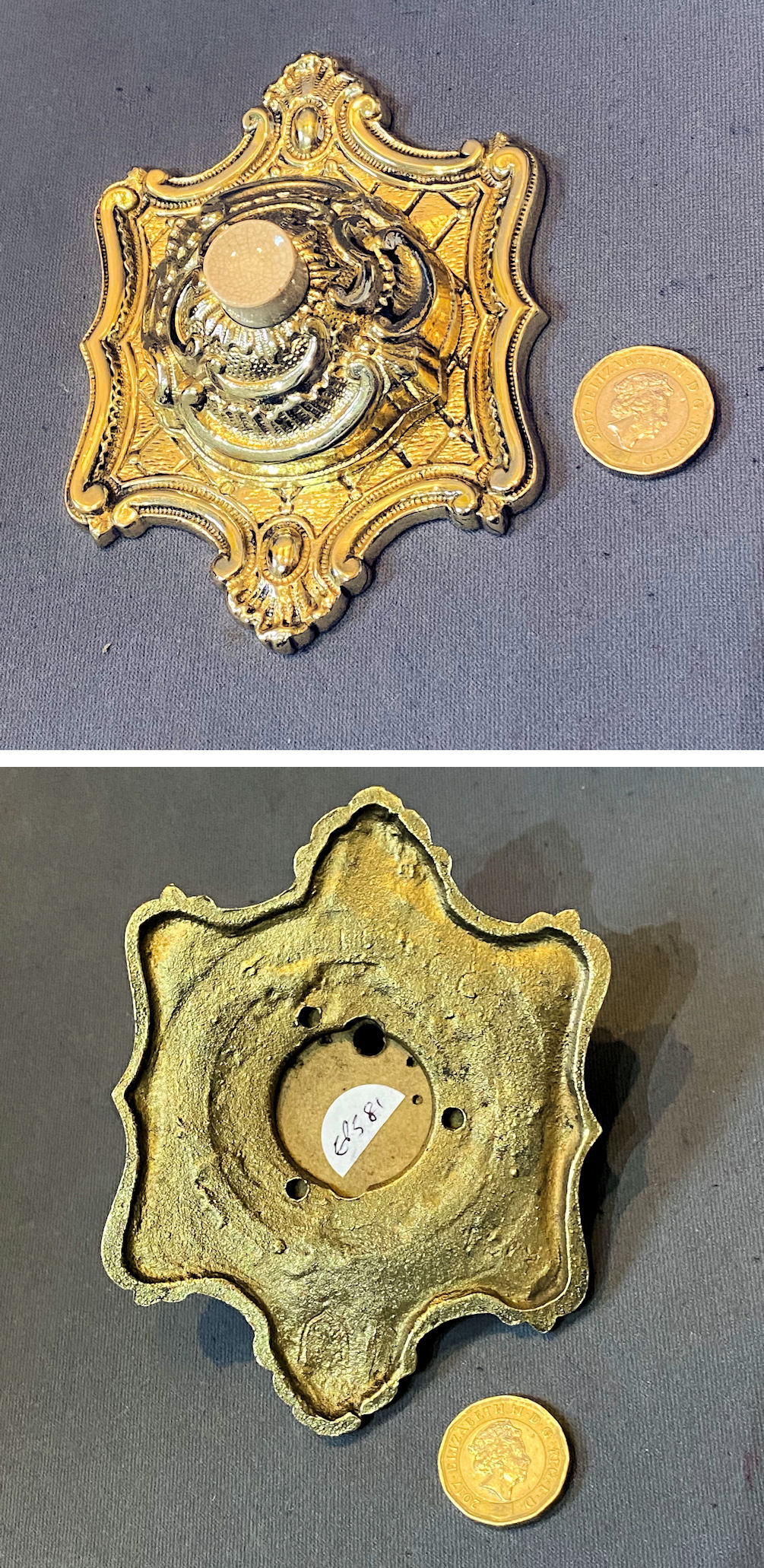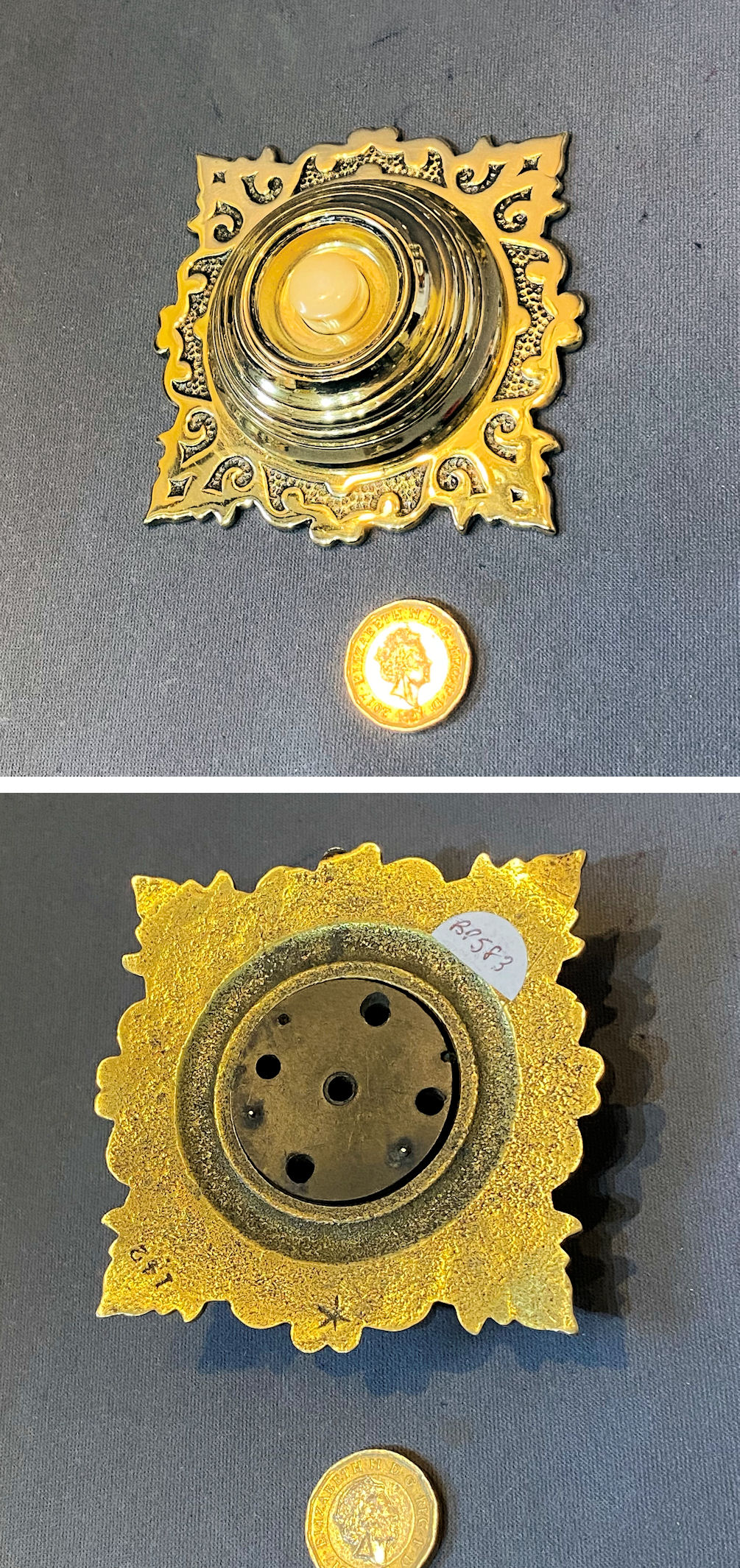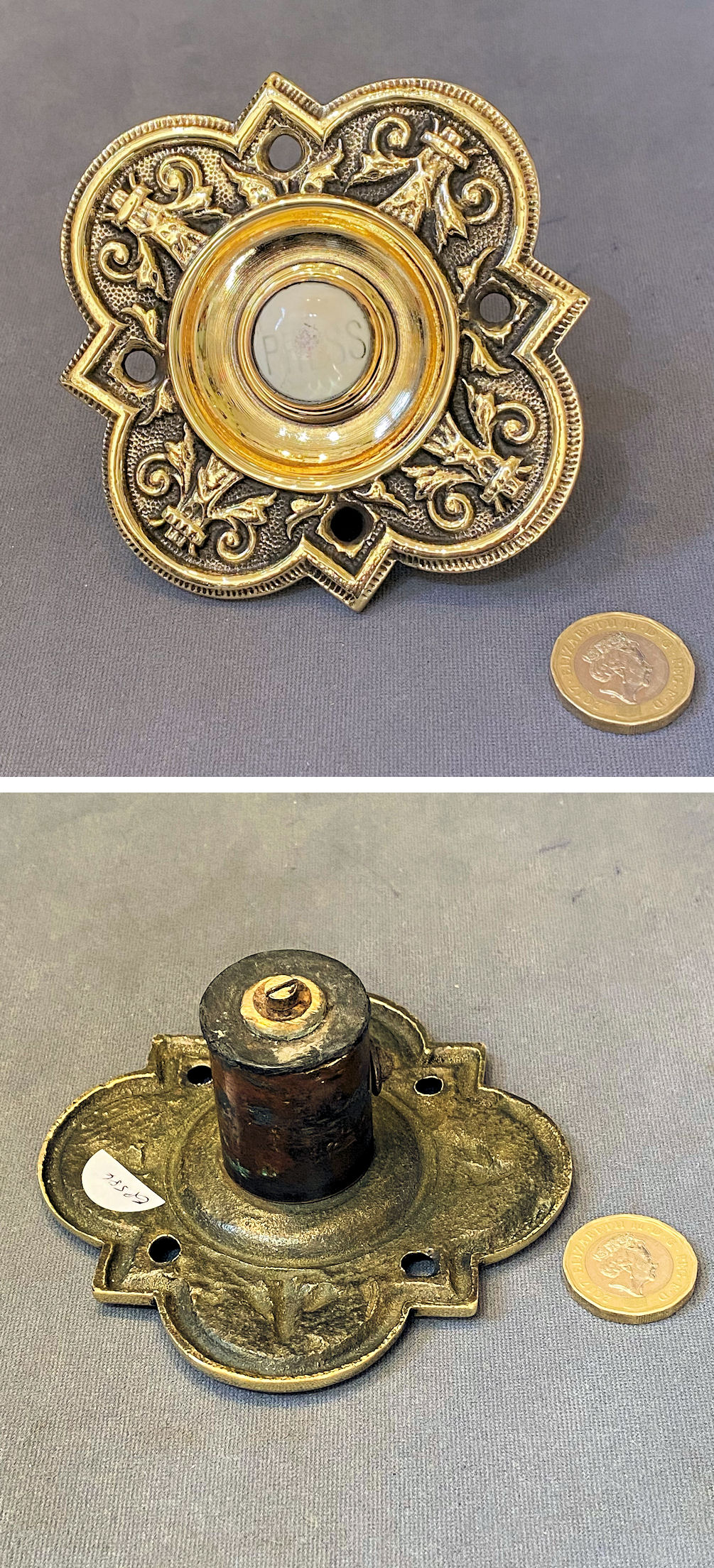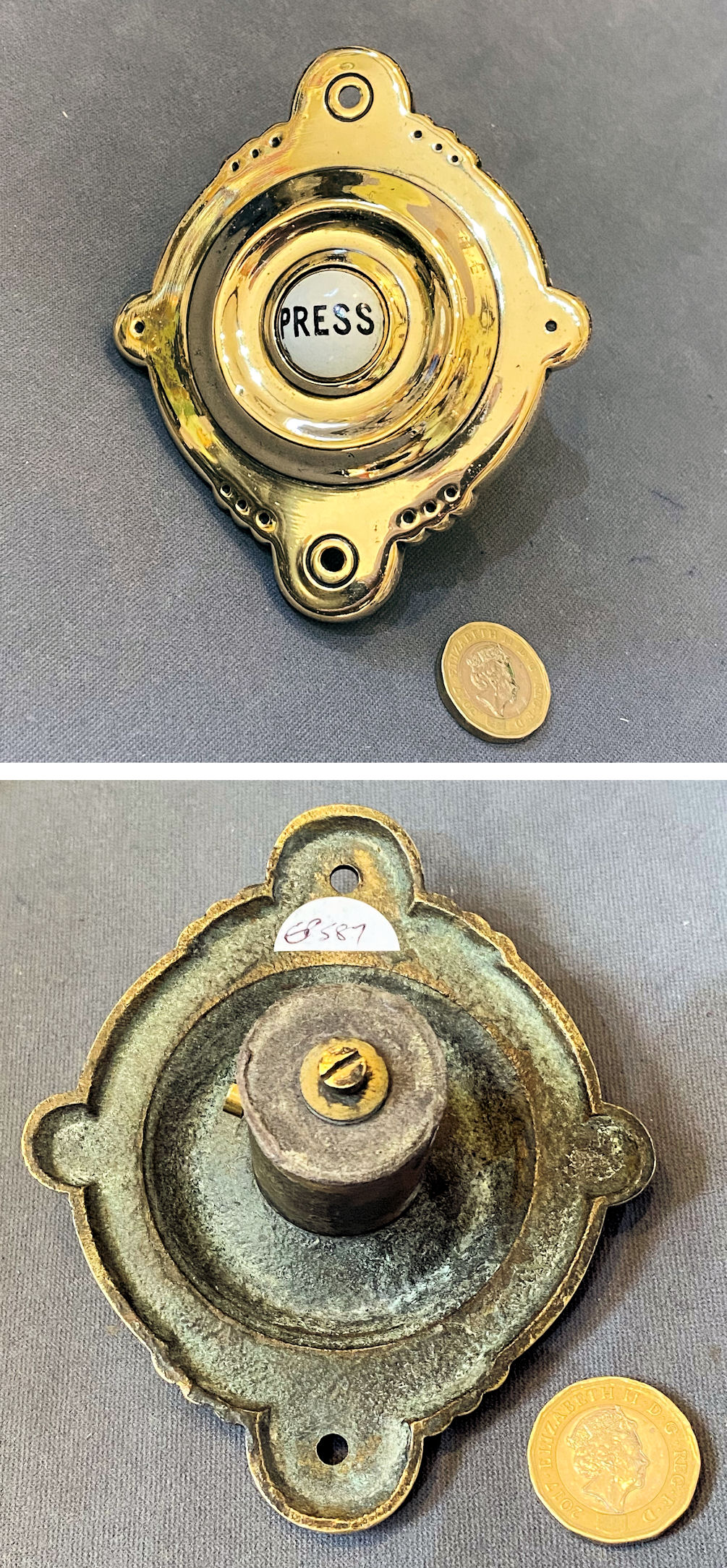Brass Exterior Electric Bell Push EP587 Original, quality 1920's cast brass external electric bell push with a central white ceramic push button, detailed "Press" in upper case black text. The unusual shaped backplate has two screw holes for mounting. For use with a 12-volt, low-voltage electric supply system. Other parts required to operate this system are usually available in stock. Fully overhauled and complete and in good and working order.