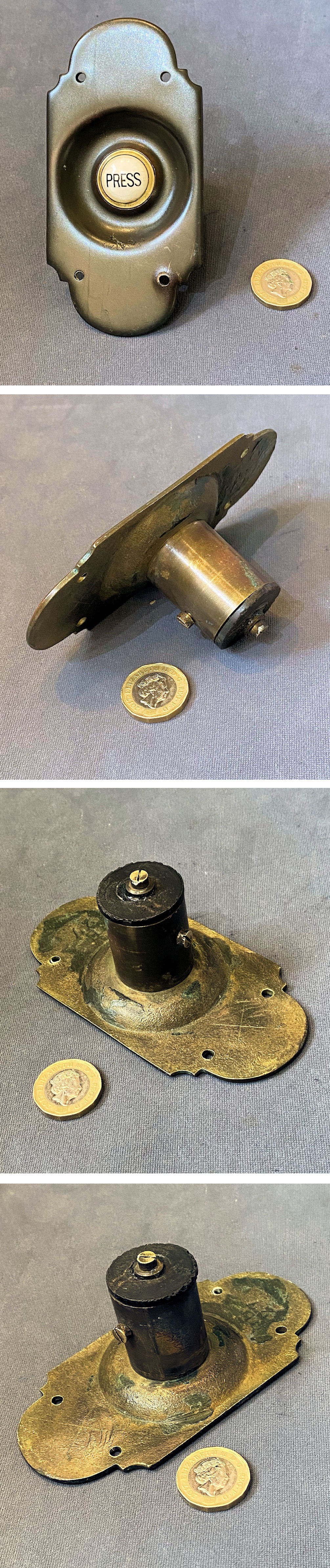 Brass Exterior Electric Bell Push EP589 Original, quality 1920's vertical cast brass external electric bell push with the original unpolished patinated green colour with four screw holes for mounting and a central white ceramic push button with "Press" in black upper cased text. For use with a 12-volt, low-voltage electric supply system. Other parts required to operate this system are usually available in stock. Fully overhauled and complete and in good and working order.