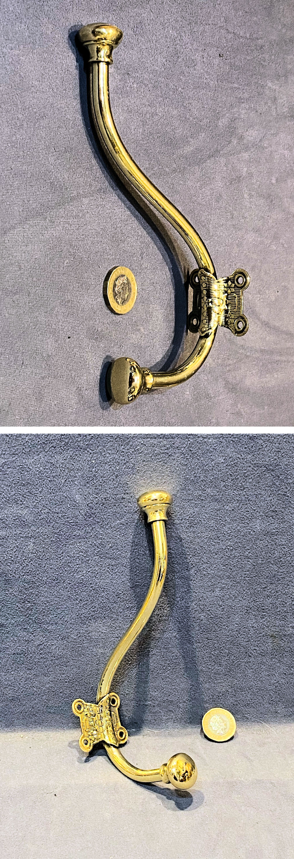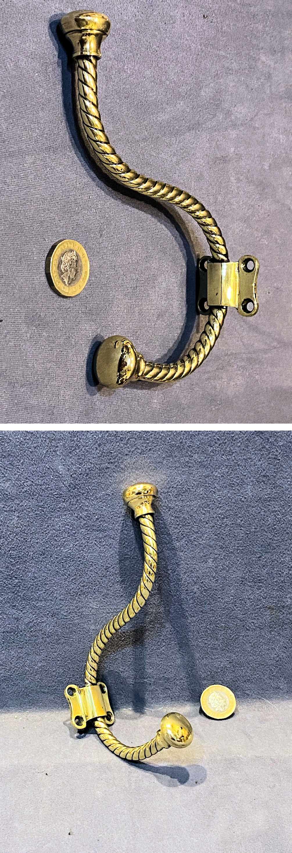 Brass Hat & Coat Hook CH134 Original, quality 1920's brass hat and coat hook with a ropetwist tubular stem, a plain cast brass backplate with four countersunk screw holes for mounting and two brass finials. Polished and lacquered, although the lacquer may be removed at no extra cost and complete and in good and working order.