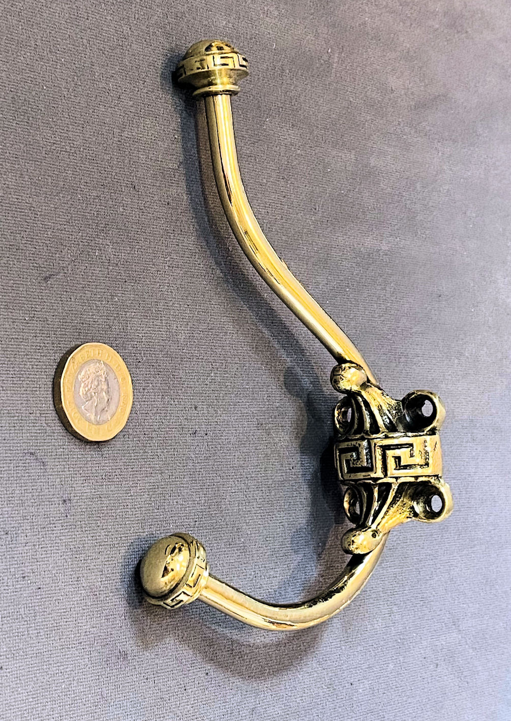 Large Brass & Ceramic Hat & Coat Hook CH140 Original, quality late 19th century larger than average brass coat hook with a "Greek Key" pattern decoration to the tubular stem mounted on a cast brass coat hook with two countersunk screwholes for mounting. The black ceramic finials have a flattened shape. All has been polished and lacquered, although the lacquer may be removed at no extra cost and is complete and in good order.
