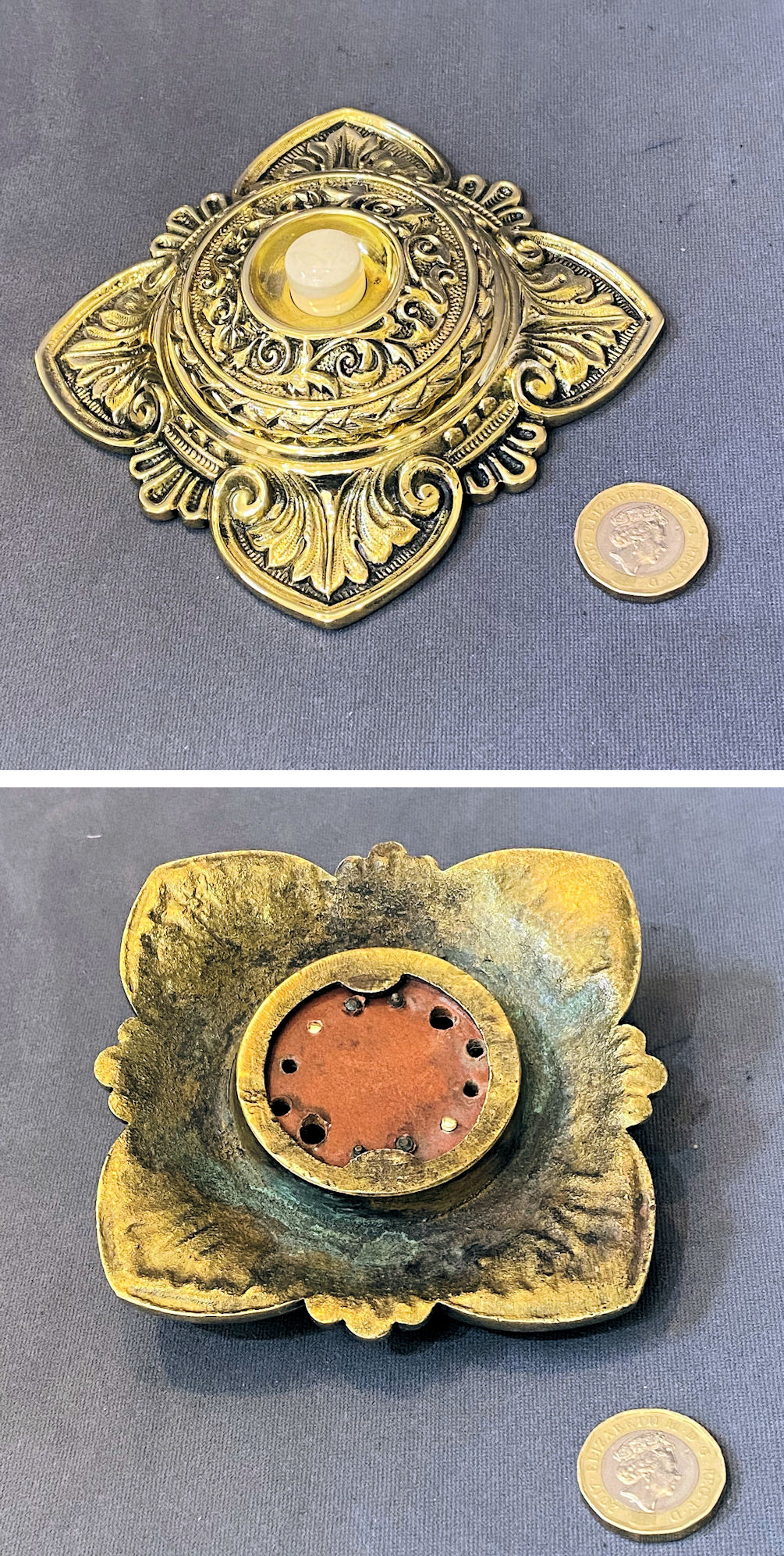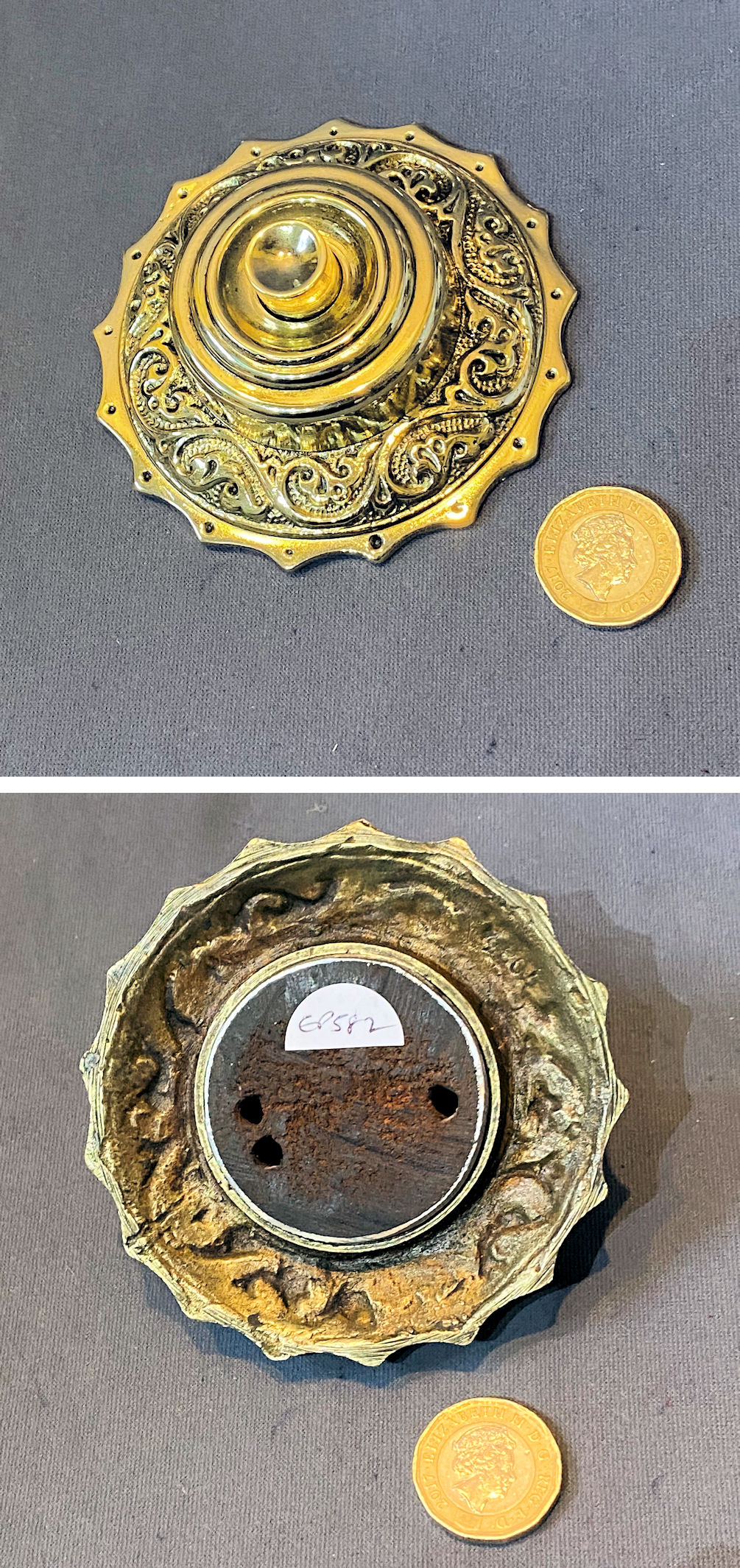 Brass Exterior Electric Bell Push EP586 Original, quality 1920's 4" diam exterior brass electric bell with a detailed decoration, a dished centre with a white porcelain press button, faintly detailed "Press" in upper cased text and four countersunk screw holes for mounting. The reverse has a "barrel 1 1/8" diam to be recessed 2". Fully overhauled, polished and complete and in good and working order.