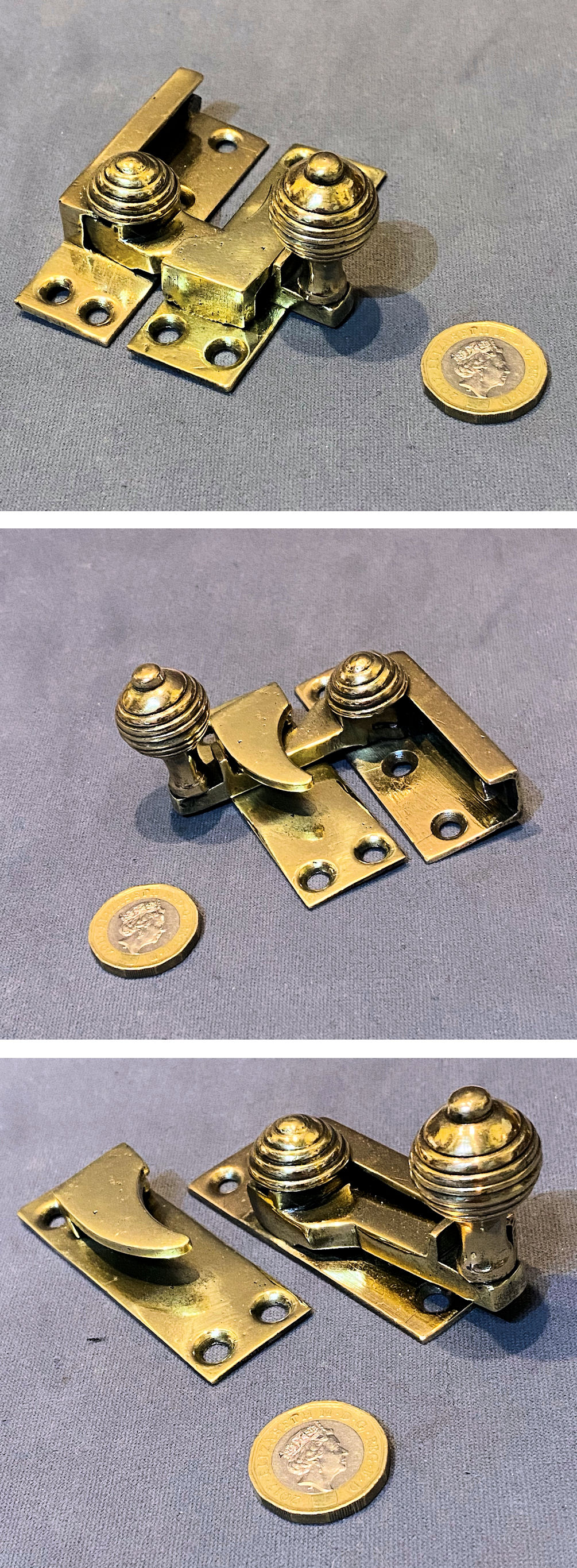 Brass Sash Window Catches, 4 matching available W534 Original, quality late 19th century two piece brass sash window catch with ribbed finials. A good spring and four countersunk screw holes for mounting to each piece. Fully overhauled, polished and lacquered, although the lacquer may be removed at no extra cost and complete and in good and working order.