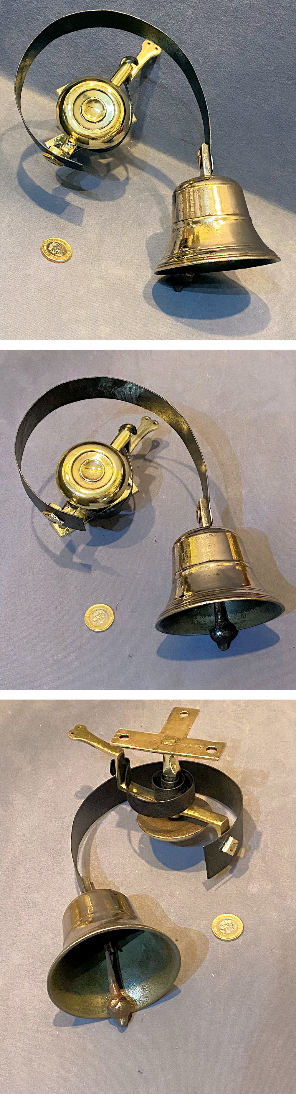 Brass Servants Intercom Bell IB352 Original, quality late 19th century brass intercom bell with brass nuts, steel springs and a central brass boss. Can be pulled from either left or right. For use with a tight wire, non-electrical bell system. Other parts required to operate this system are usually available in stock. Other similar bells may be available on request. Often now referred to as 'Downton Abbey' bells. The ironwork has been repainted, and the brass polished and lacquered, although the lacquer may be removed at no extra cost. Fully overhauled and all is complete and in good and working order.