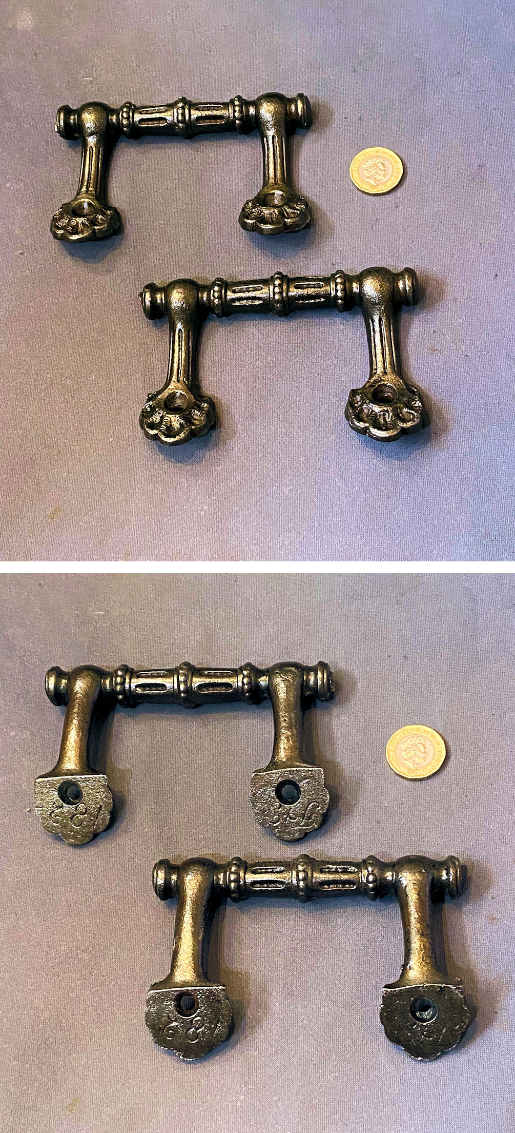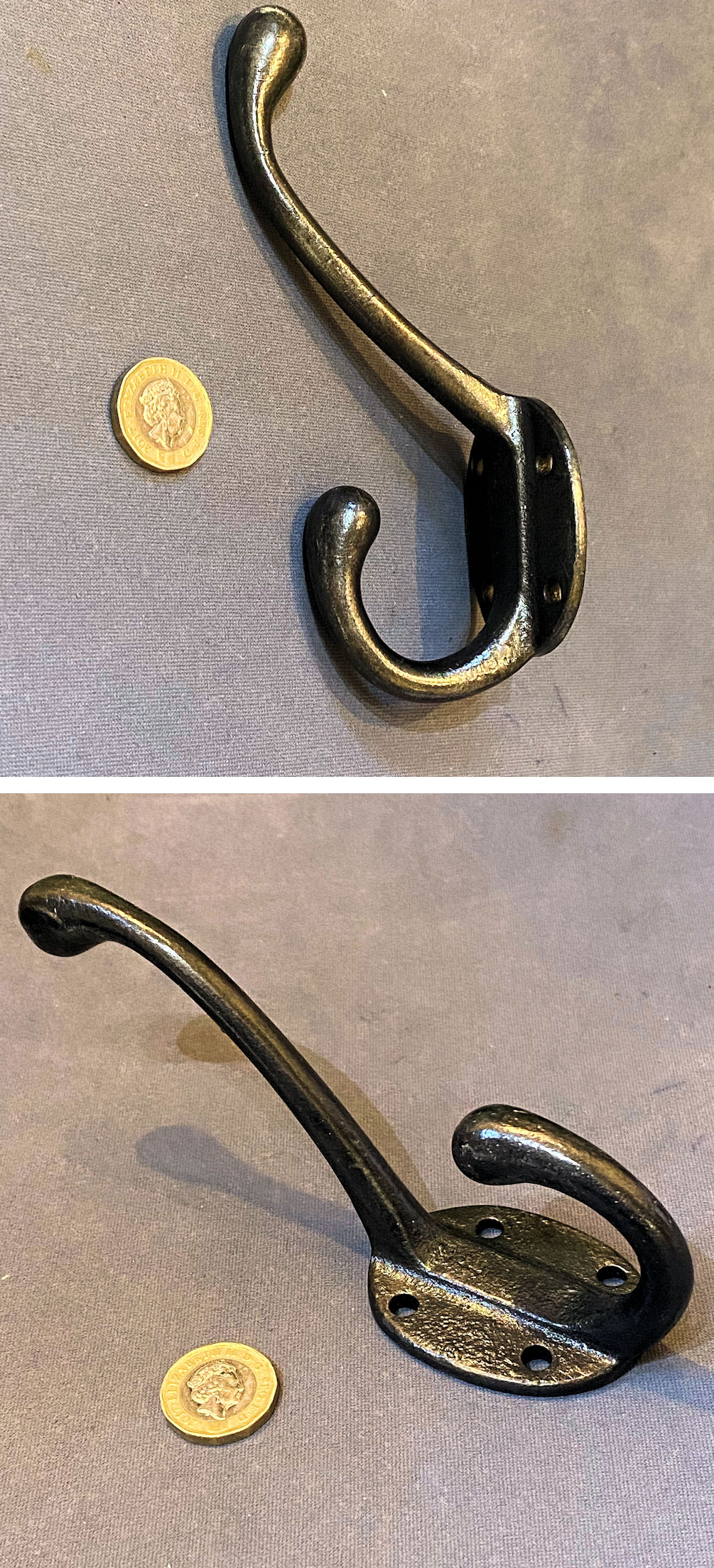 Cast Iron Hat & Coat Hook, 2 available CH155 Original, quality late 19th century cast iron hat and coat hook with an oval backplate with four countersunk screw holes for mounting and two stems with shaped tips, the top one for the hats and the lower for coats. Cleaned and lacquered and complete and in good and working order.