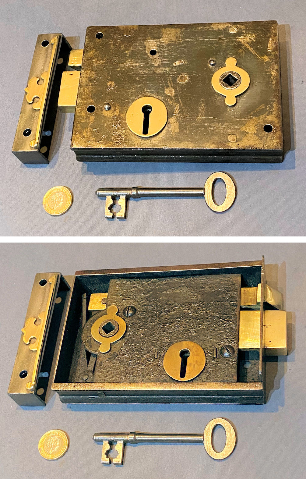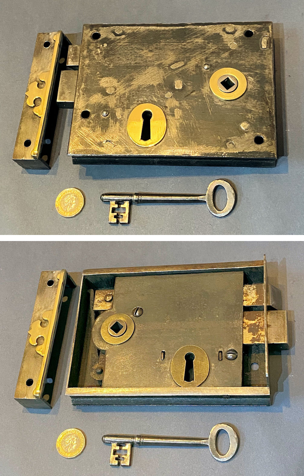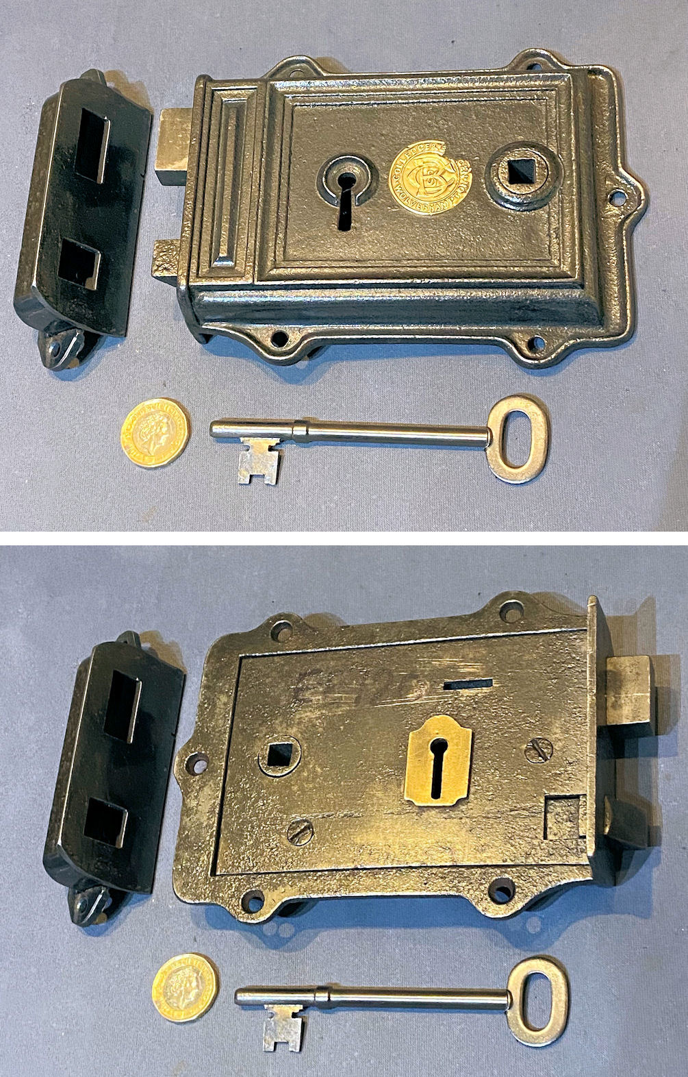 Cast Iron Rim Lock RL991 Original, quality 1920's surface mounted cast iron door lock. Will take a standard modern square bar for the handles. A replacement keep has been made to suit with a replacement key cut to fit. This lock has the provision for a handle turn and a key lock. This example has the original circular brass makers' plate detailing "Colledge & Co Wolverhampton" and has a mounting flange all round with five screw holes to the lock and three to the keep. Cleaned and lacquered, fully overhauled and all is complete and in good and working order.
