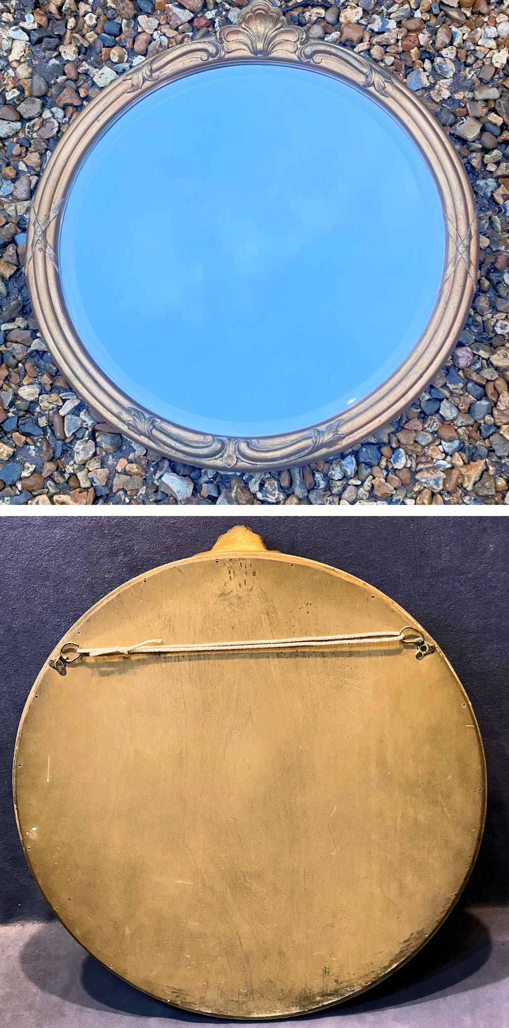 Circular Bevelled Wall Mirror M224 Original, quality 1930's / 40's circular plaster on wood wall mirror frame with a bevelled mirror. The frame has acanthus leaf decoration and an old gilt painted surface, and the mirror has some minor blemishes. Otherwise all is complete and in good and working order.