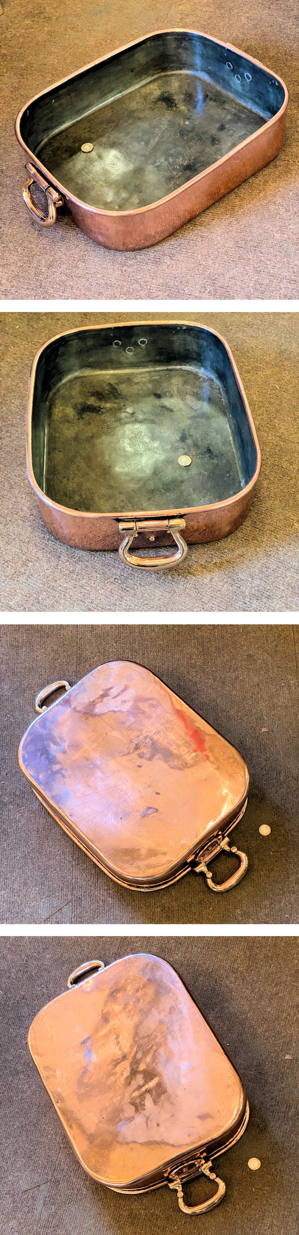 Copper Bain Marie Pan CP139 Original, quality late 19th century all copper rectangular "Bain Marie" base pan. This super example has rounded corners, a rolled over top rim, hinged side ring handles and a good tinned interior. Ideal for a braising pan or with copper saucepans stood in as a Bain Marie. Polished and lacquered, although the lacquer may be removed at no extra cost and complete and in good and working order.