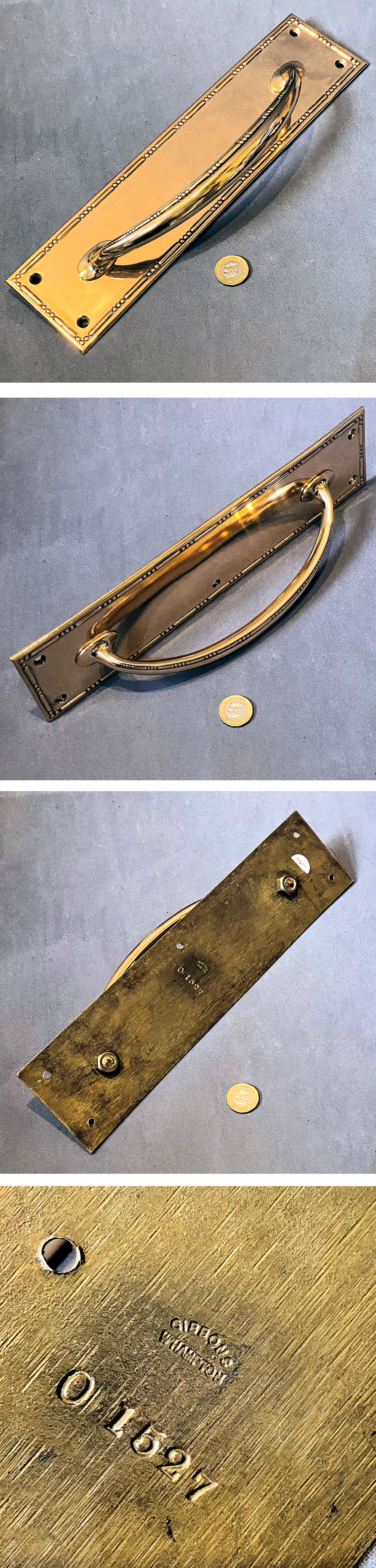 Gibbons Brass Door Pull DP644 Original, quality single late 19th century pink brass door pull with a cranked and tapered bar mounted on a rectangular brass backplate. The backplate has a beaded decoration, as has the leading edge of the pull bar, and the reverse is impressed for the maker "Gibbons of Wolverhampton". All has been polished and lacquered, although the lacquer may be removed at no extra cost and is complete and in order.