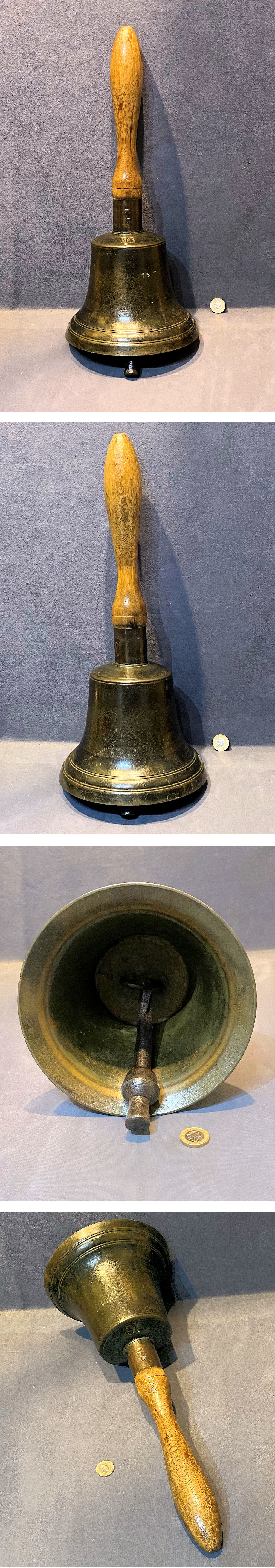 Huge Town Criers Handbell B340 Original, quality mid to late 19th century very large "Town Criers" handbell in the original patina to the cast brass bell. This super and loud bell has the original blacksmith made clapper to the inside, No "16" to the shoulder and the original turned oak or hickory handle. A good tone and resonence and all is complete and in good and working order.
