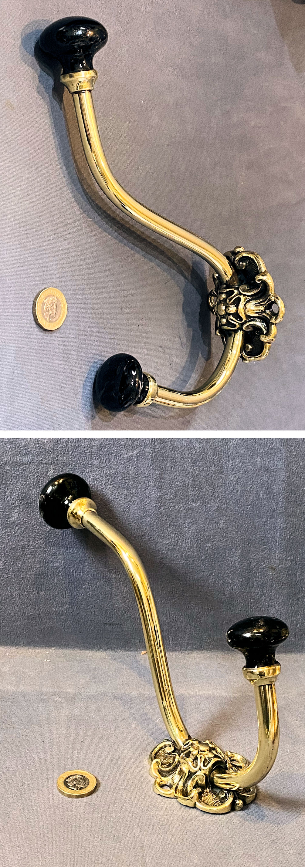 Brass & Ceramic Hat & Coat Hook CH139 Original, quality late 19th century brass hat or coat hook with a decorated tubular stem, a cast brass backplate with four countersunk screw holes for mounting and two ovoid black ceramic finials. Polished and lacquered, although the lacquer may be removed at no extra cost and is complete and in good and working order.