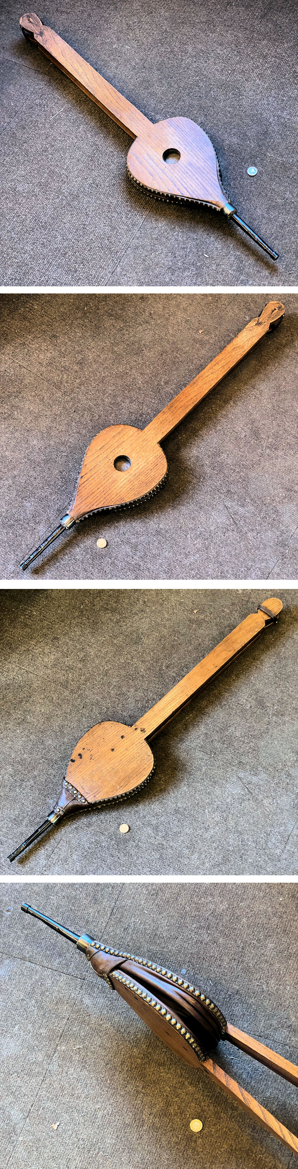 Oak Fireside Bellows B91 Original, quality post-war pair of oak fireside bellows in superb condition with a steel and wrought iron spout and good leather work bound and mounted with brass studs. This example has long arms to keep away from the heat when in use. Complete and in good and working order.
