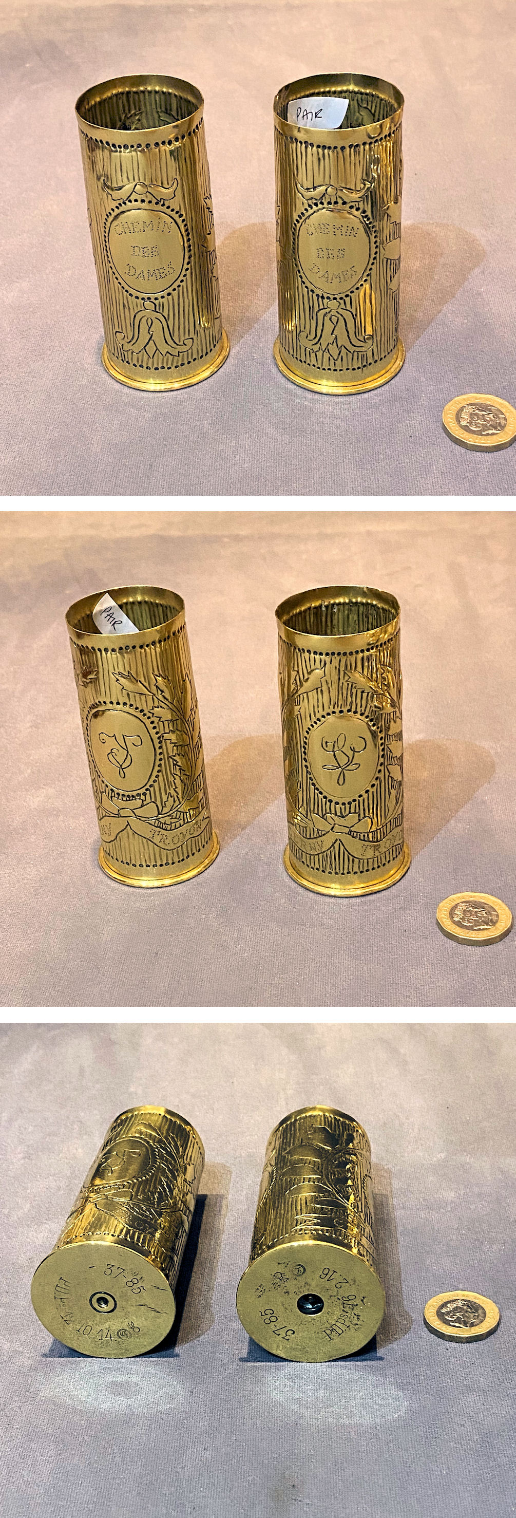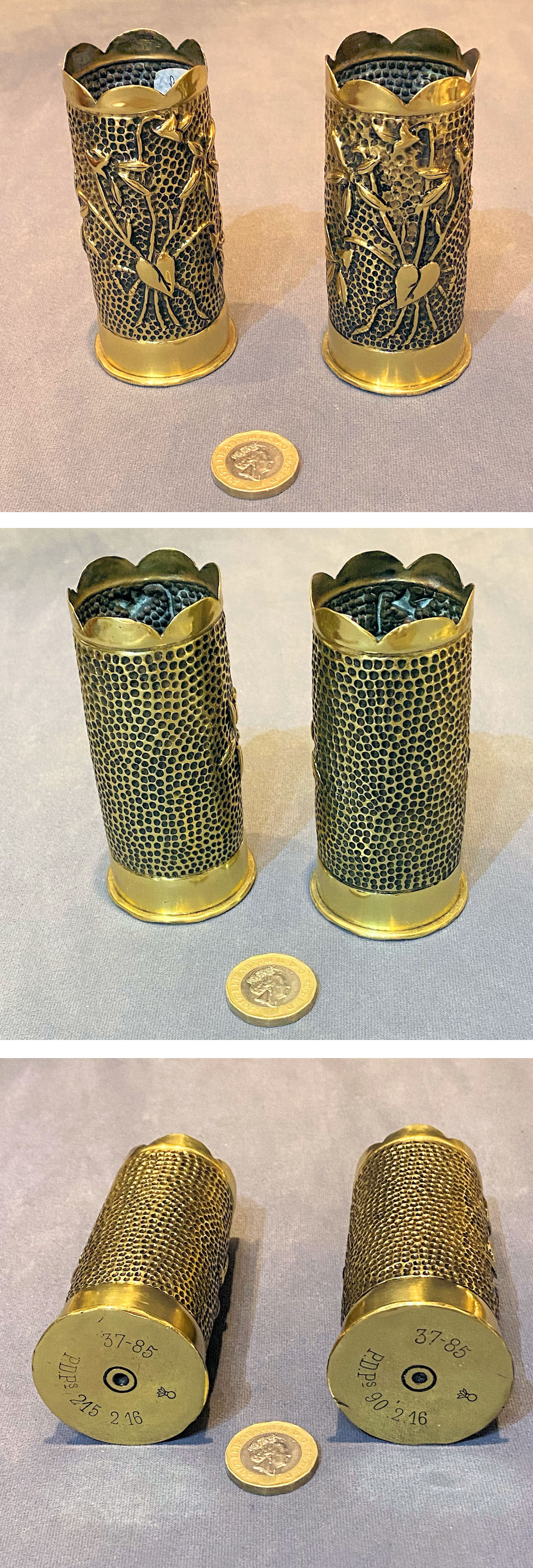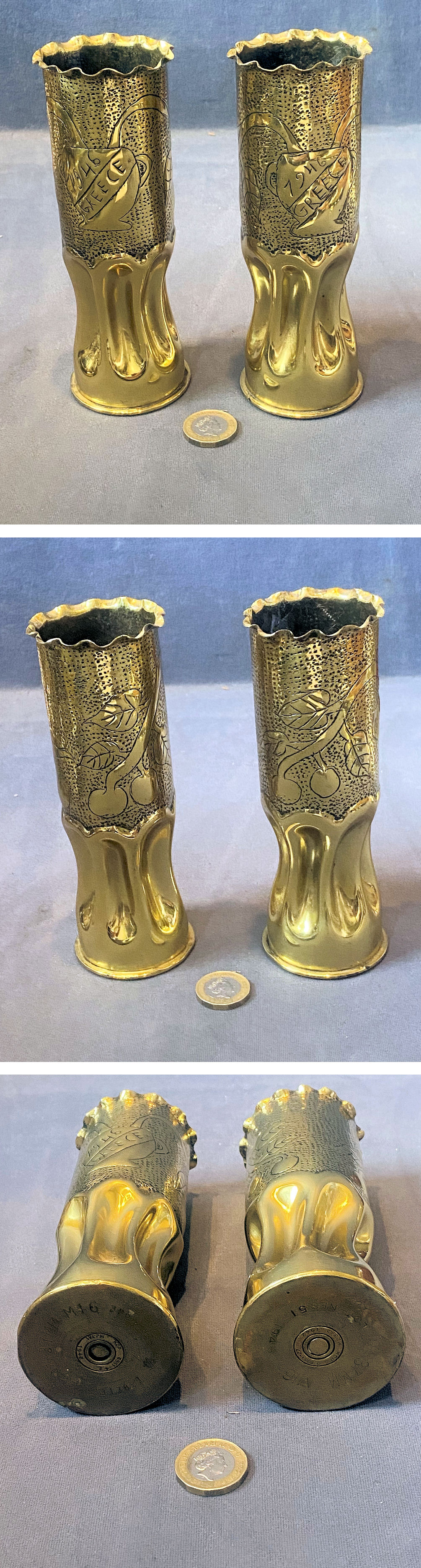 Pair of 1942 Trench Art Brass Shell Cases SC314 Original, quality pair of 37mm brass shell cases, trench art punch engraved with an urn with plants detailed for "1946 Greece" to both. The lower half of the body has ribbing and the undersides are impressed "1942" and "1943", "37mm", "M16". All have been polished and lacquered, although the lacquer may be removed at no extra cost and are complete and in good and working order.
