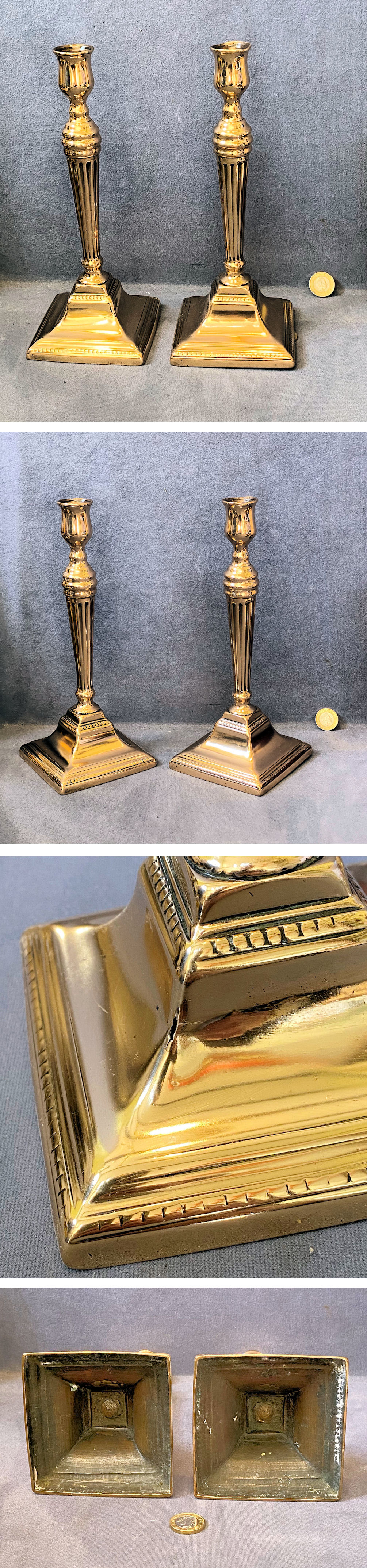 Pair of Brass Candlesticks CS246 Original, quality pair of mid to late 19th century reeded pink brass candlesticks on square bases, with a beaded design to the plinth. Polished and lacquered, although the lacquer may be removed at no extra cost. Minor split to one shoulder ( see picture ), otherwise complete and in good and working order.