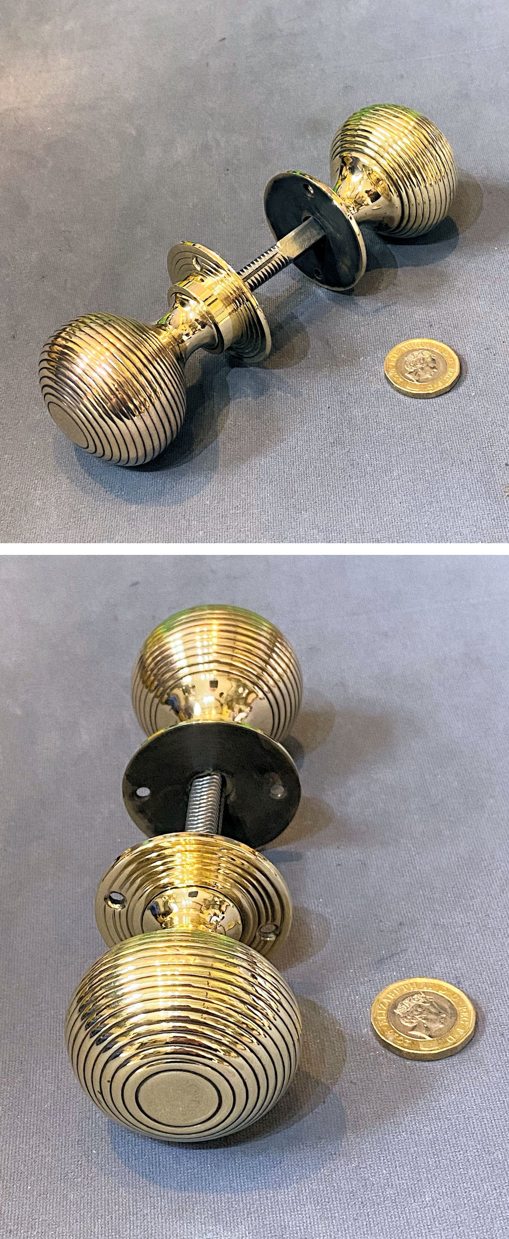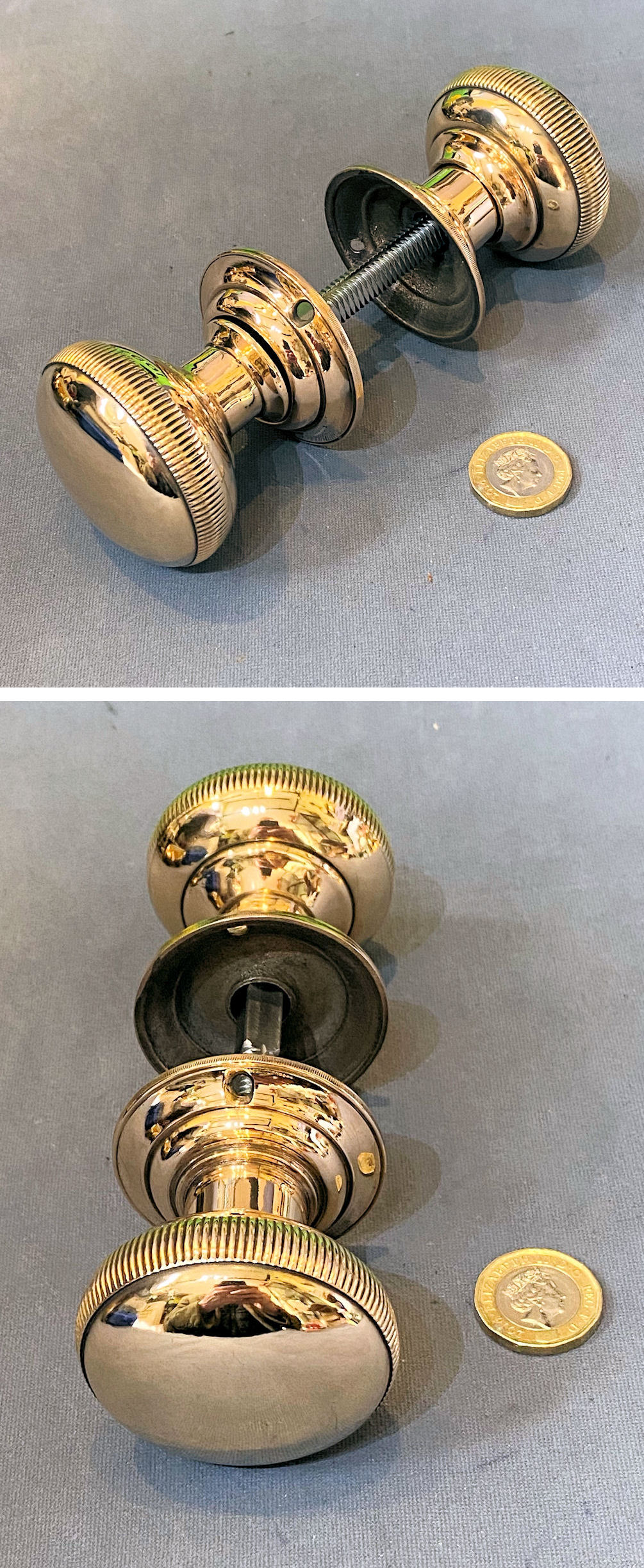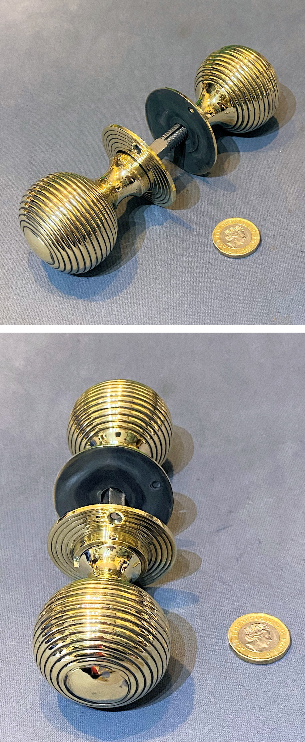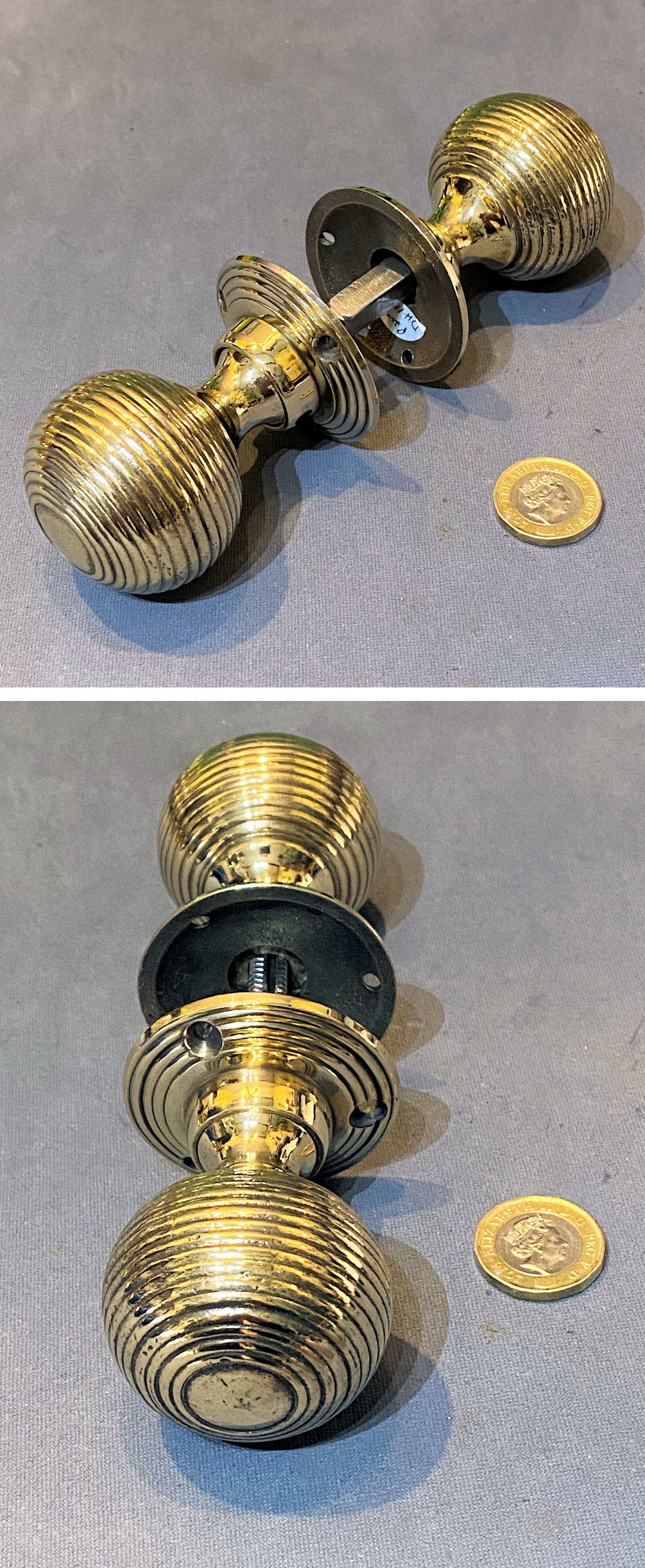 Pair of Ribbed Brass Door Handles DH1176 Original, quality pair of ribbed brass spherical shaped door knobs with matching circular backplates, each with three countersunk screw holes for mounting. With a threaded standard square bar and grub screw adjustment system to fit both mortice and rim locks and latches and complete and in good and working order.