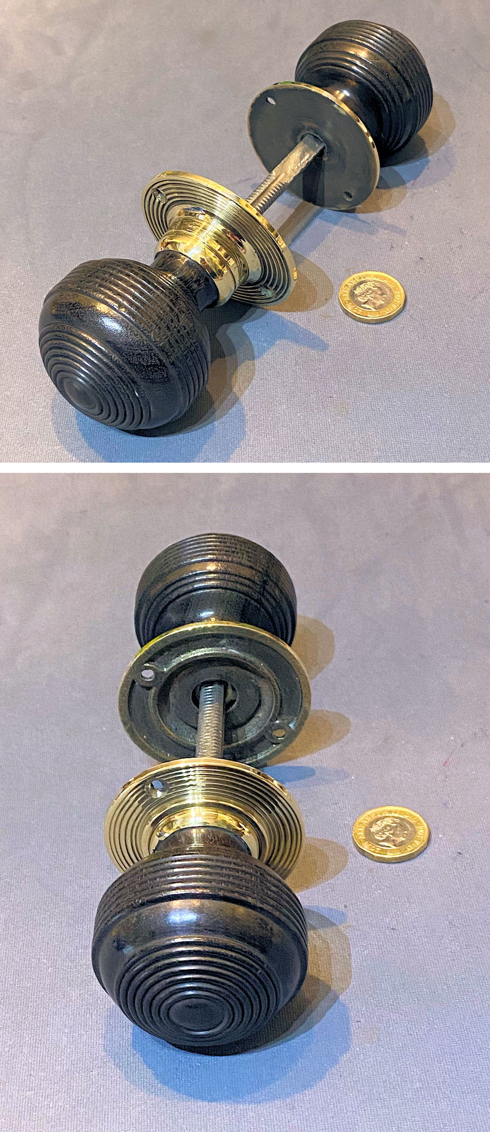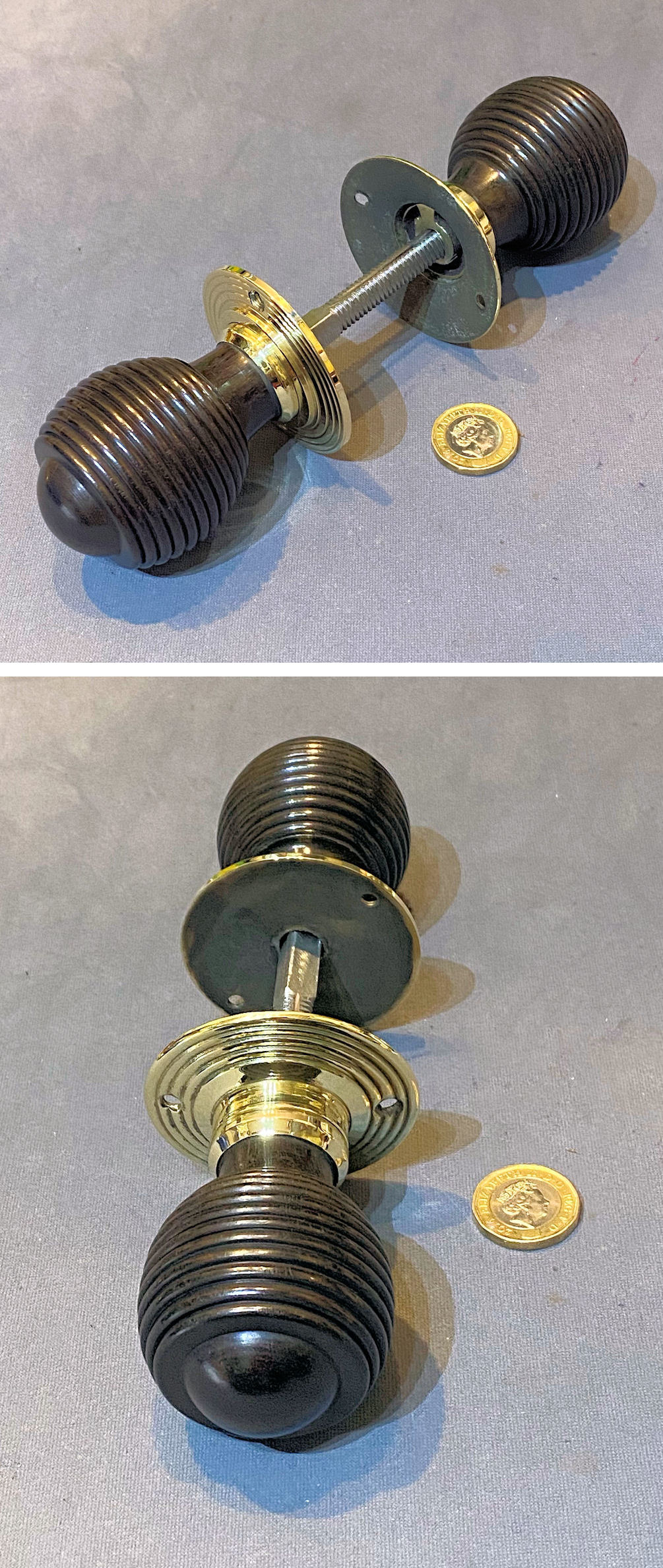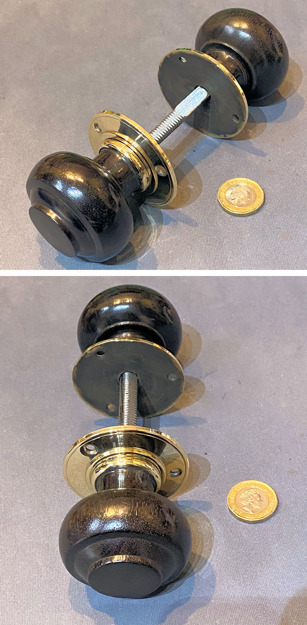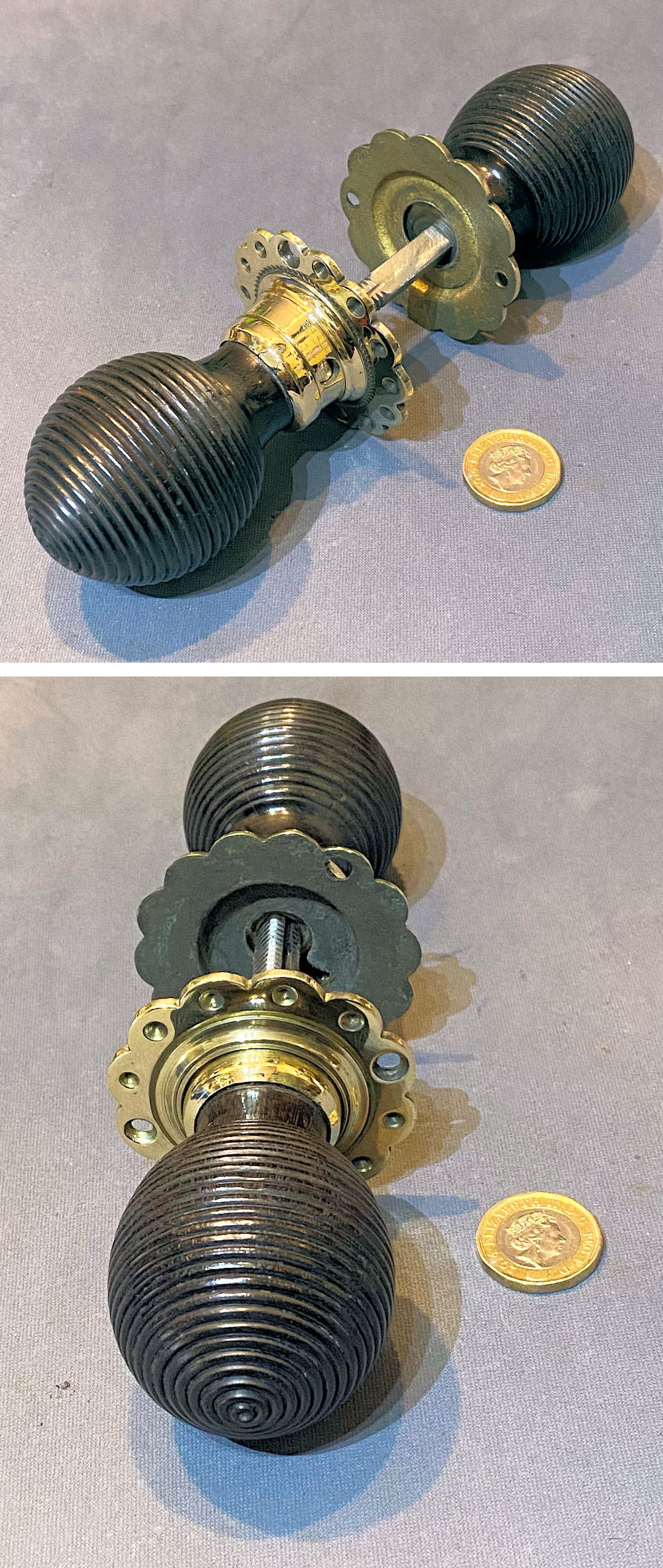 Pair of Ribbed Ebony Door Handles, 2 pairs available DH1172 Original, quality pair of late 19th century spherical shaped ribbed ebony door knobs with brass collars and circular brass backplates, each with two countersunk screw holes for mounting. One backplate is a replacement made to suit. With a threaded standard square bar and grub screw adjustment system to fit both mortice and rim locks and latches. Complete and in good and working order.