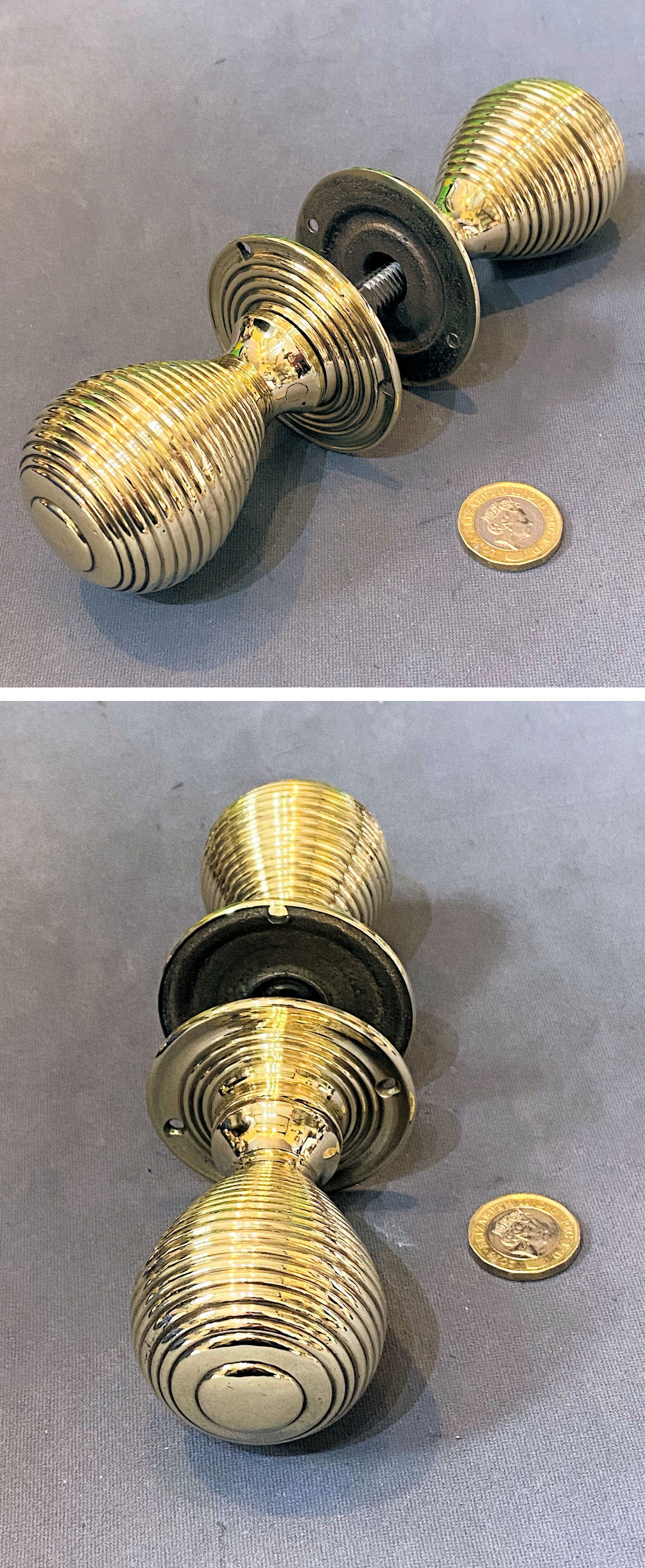 Pair of Ribbed Brass Door Handles DH1178 Original, quality pair of 19th century ovoid shaped ribbed brass door knobs with circular matching backplates with two and three countersunk screw holes for mounting. With a threaded standard square bar and grub screw adjustment system to fit standard mortice locks and latches and all is complete and in good and working order.
