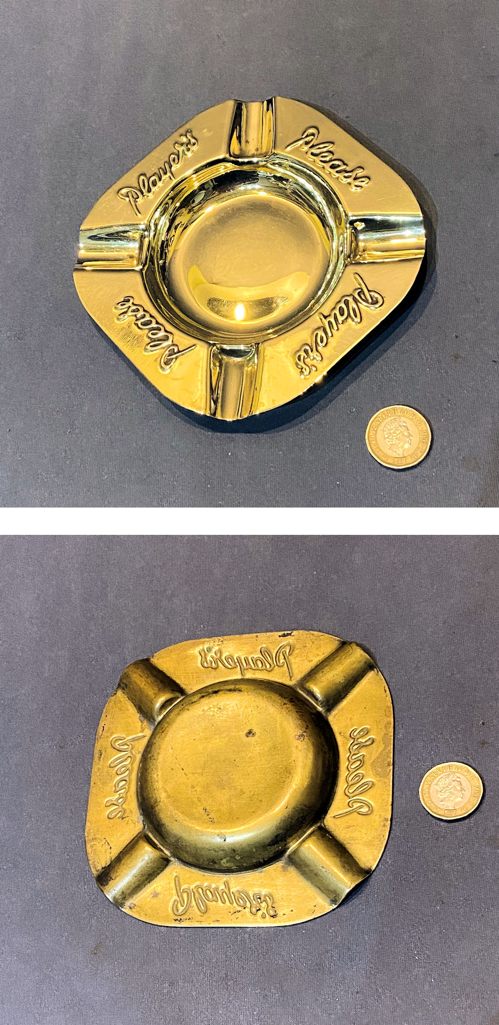 Players Please Brass Ashtray A208 Original, quality 1920's square brass ashtray with four corner cigarette rests and "Players Please" embossed to the edges. Polished and lacquered, although the lacquer may be removed at no extra cost and complete and in good and working order.