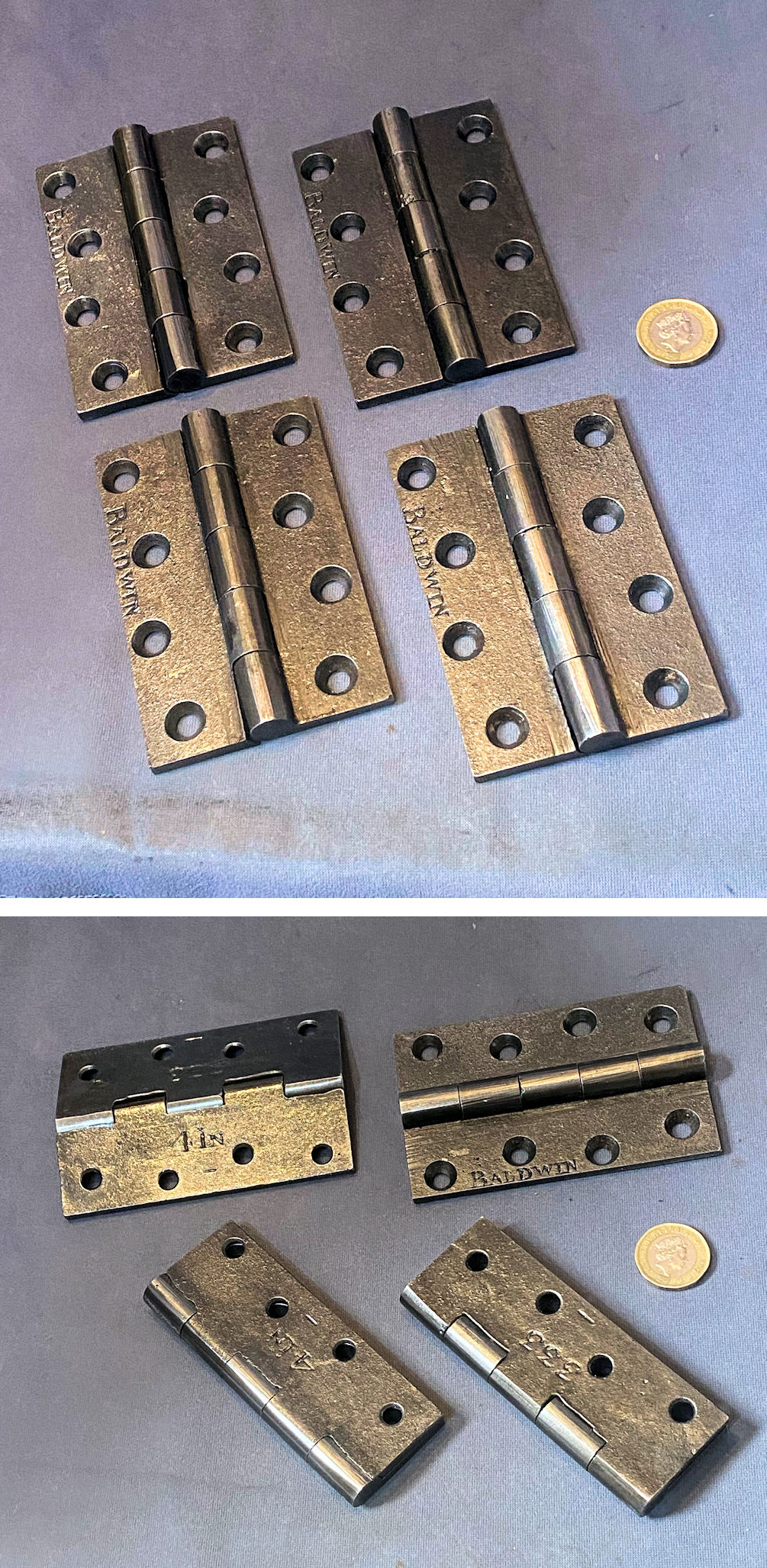 Set of 4 Baldwin Cast Iron Door Hinges H66 Original, quality set of four original, unused late 19th century cast iron 4" door hinges. Each plate has four countersunk screw holes for mounting, the face of each hinge is impressed "Baldwin" for the manufacturer, and the reverses are impressed "4in" and "333" for the model number. All have been cleaned and lacquered and are complete and in good and working order.