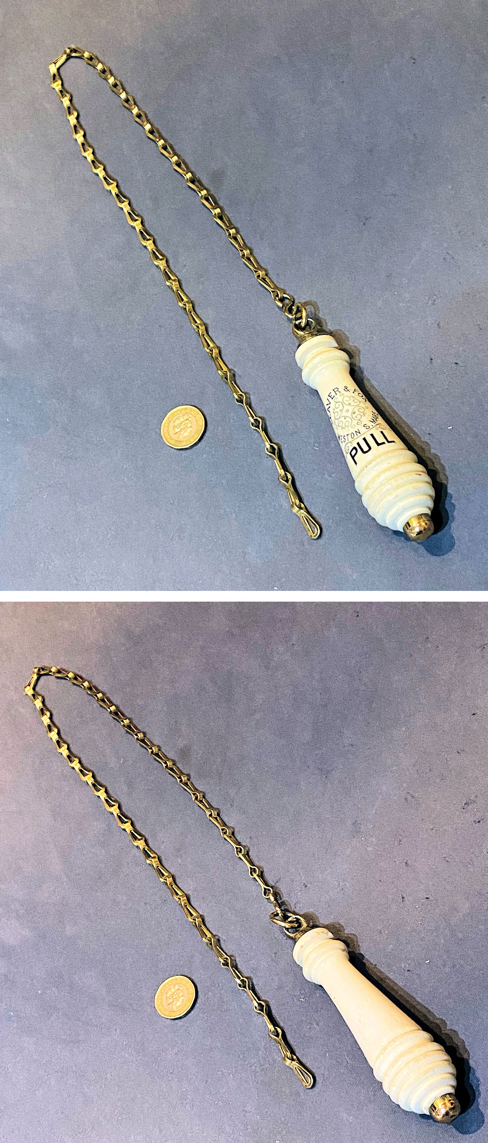 Pair of In & Out Brass Fingerplates, 2 pairs available FP591 Original, quality late 19th century cast pink brass rectangular shaped vertical fingerplates with inlaid white enamel in tall upper cased letters "IN" and "OUT". No damage to the enamel and each plate has six countersunk screw holes for mounting. Some minor scratches, all are complete and in good and working order otherwise have been lacquered, although the lacquer may be removed at no extra cost. One pair = A and one pair = B.