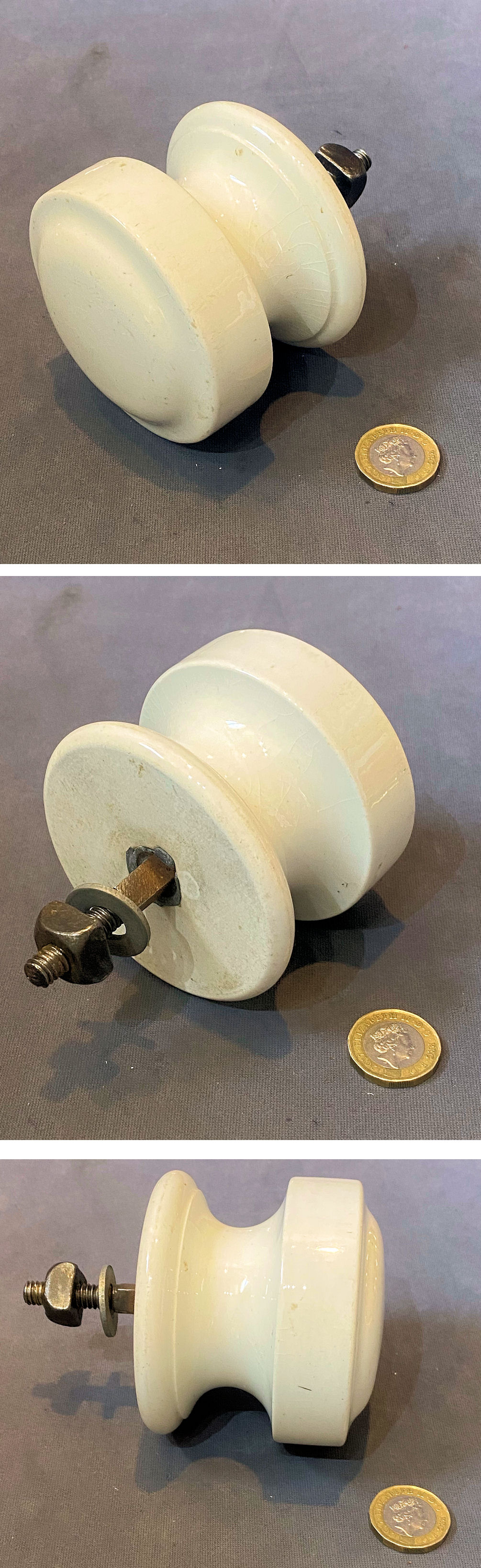 White Ceramic Door Pull Knob DP650 Original, quality late 19th century white ceramic door pull knob with a steel thread, nut and washer. This spherical shaped example has a cushioned front with flat sides and is waisted towards the back. This handle will not turn a lock or latch, only pull the door closed. All is complete and in good and working order.