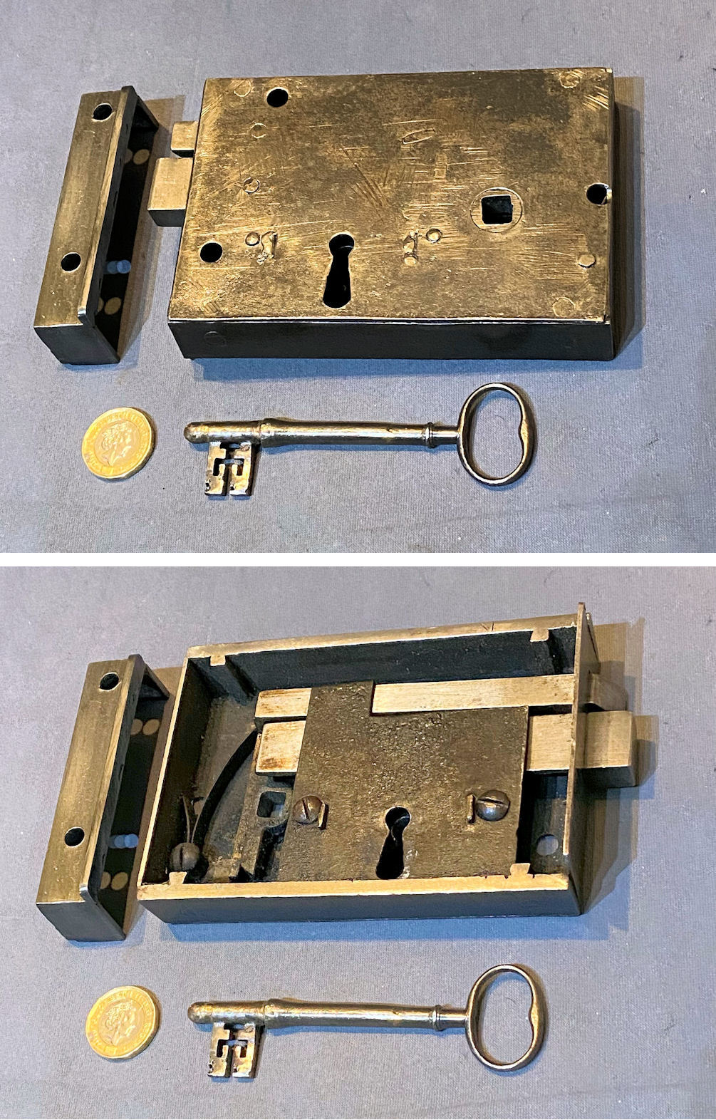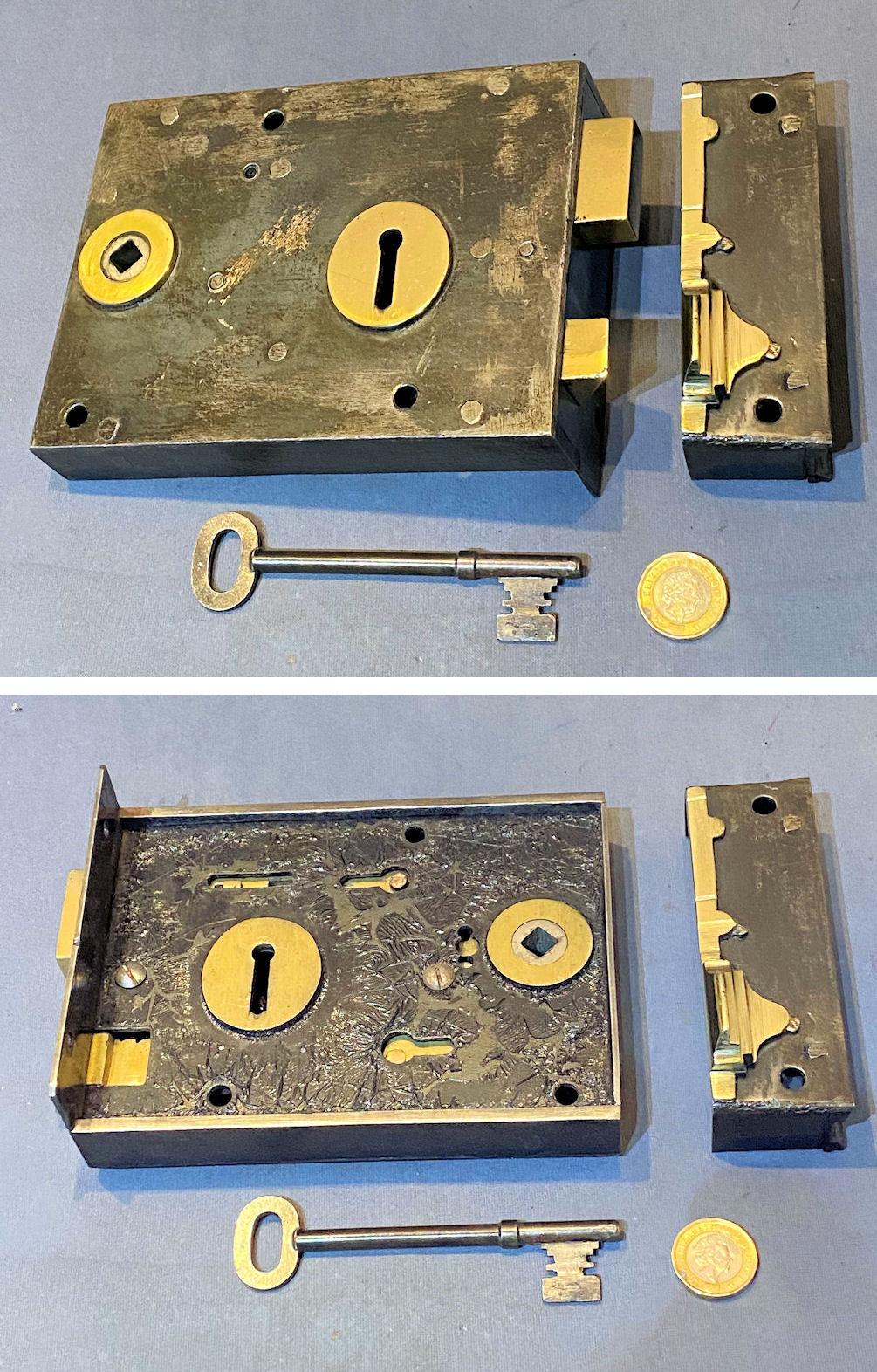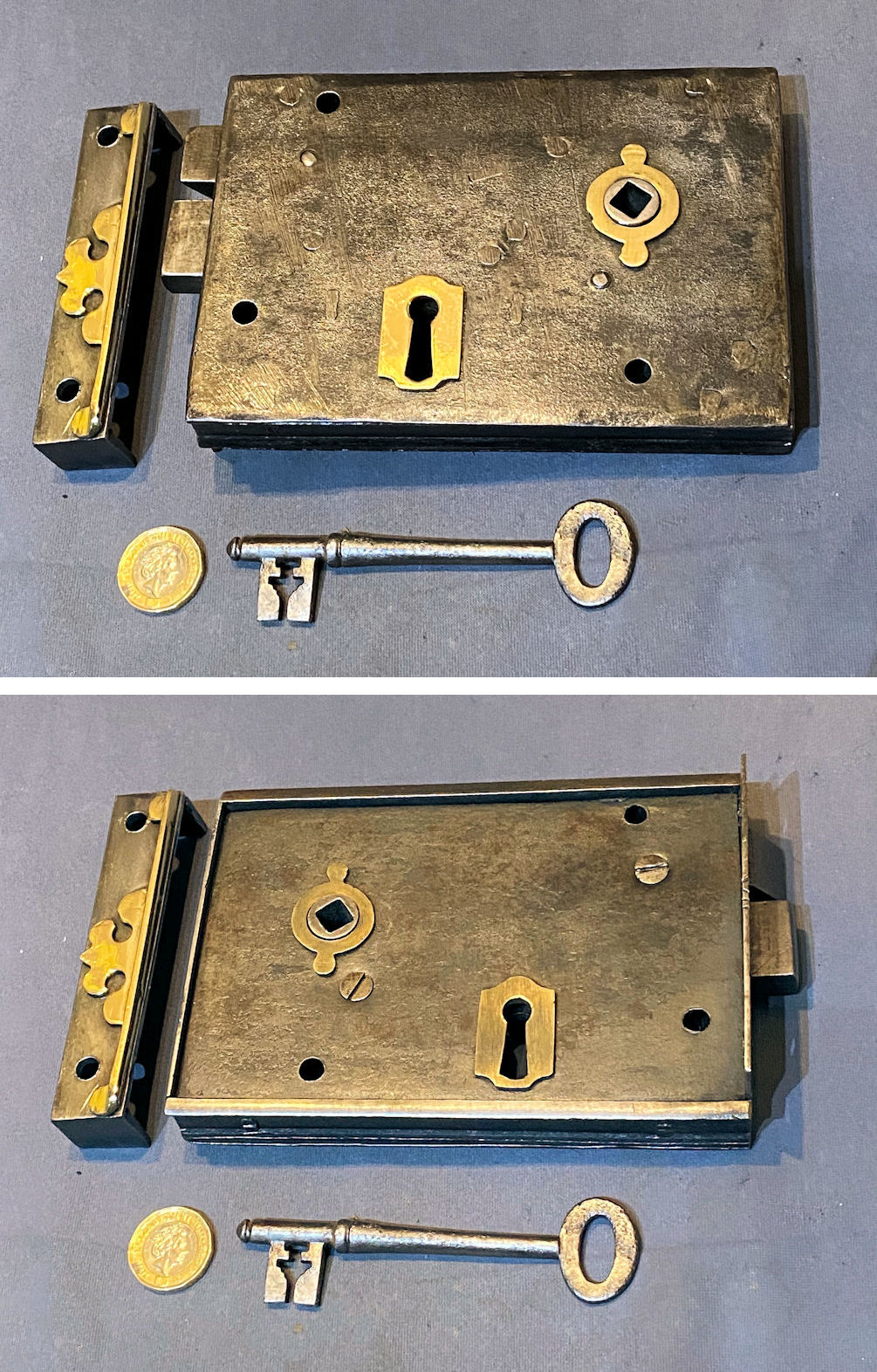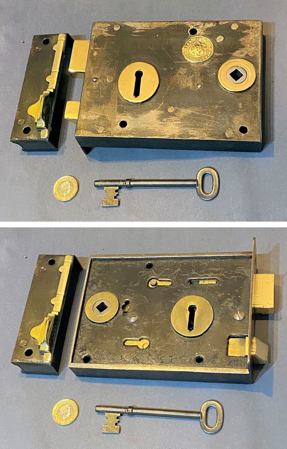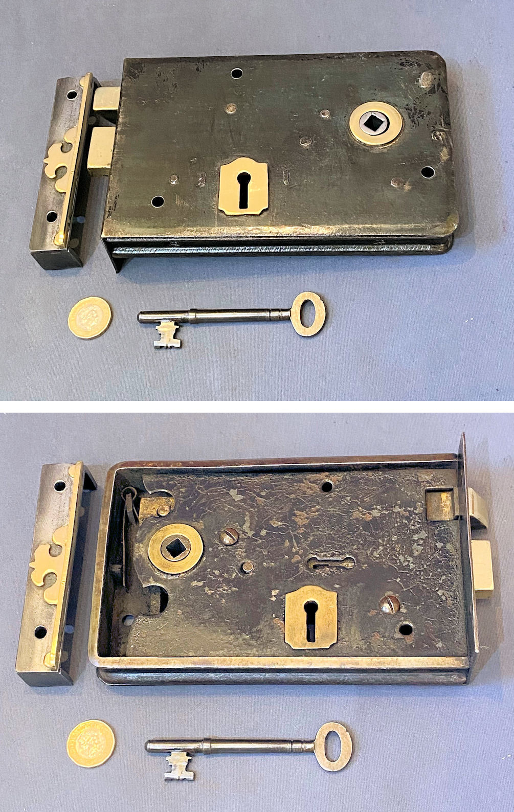Wrought Iron Rim Lock RL990 Original, quality 1920's mounted wrought iron door lock with brass mounts. Will take a standard modern square bar for the handles, and with a replacement key cut to fit. The original keep this lock has the provision for a handle turn and a key lock, but is not suitable for oval shaped door knobs. The file marks are the original to when the lock was manufactured. This super example was manufactured by "Eckstein & Co of Birmingham", but the circular brass makers' plaque is missing. Cleaned and lacquered, fully overhauled and all is complete and in good and working order. A matching door lock, on the other hand, may well be available ref code RL989.