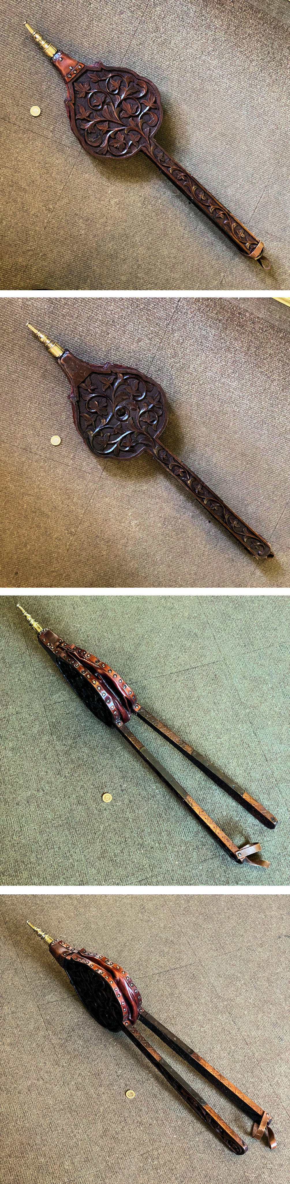 Pair of Carved Mahogany Fireside Bellows B90 Pair of late 19th century fireside bellows in mahogany with well detailed carved leaf designs. These long armed examples are in superb condition with the original red / brown leather, brass studs, and brass spout. Both sides and the outer and inner arms are all carved with detail, and both arms have good steel plate repairs. All is complete and in good and working order with a good, serious puff.