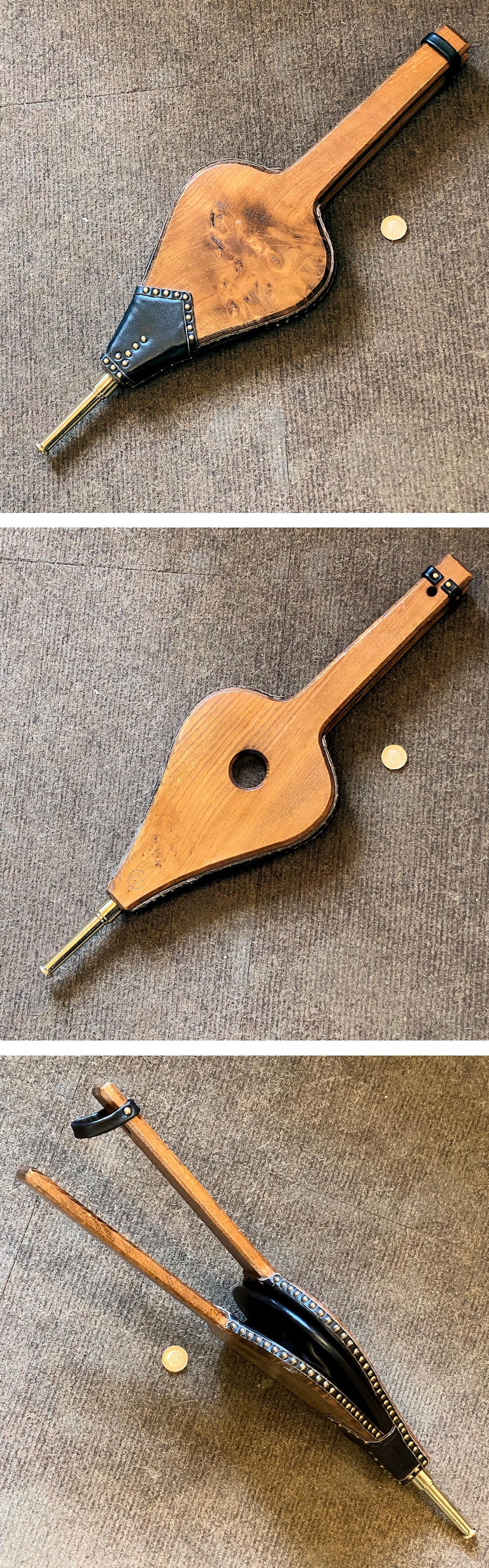 Pair of Elm Fireside Bellows B89 Original, quality pair of post-war fireside bellows of superb quality with well grained elm sides, good leather and a brass spout. The reverse is stamped "JJ" for the maker. As clean as you can find and complete in good and working order.