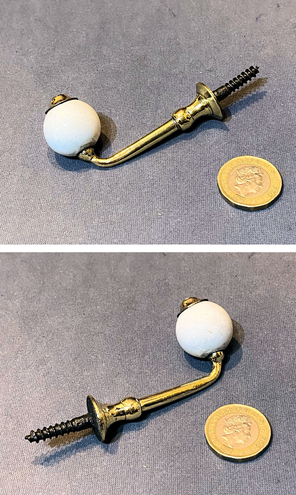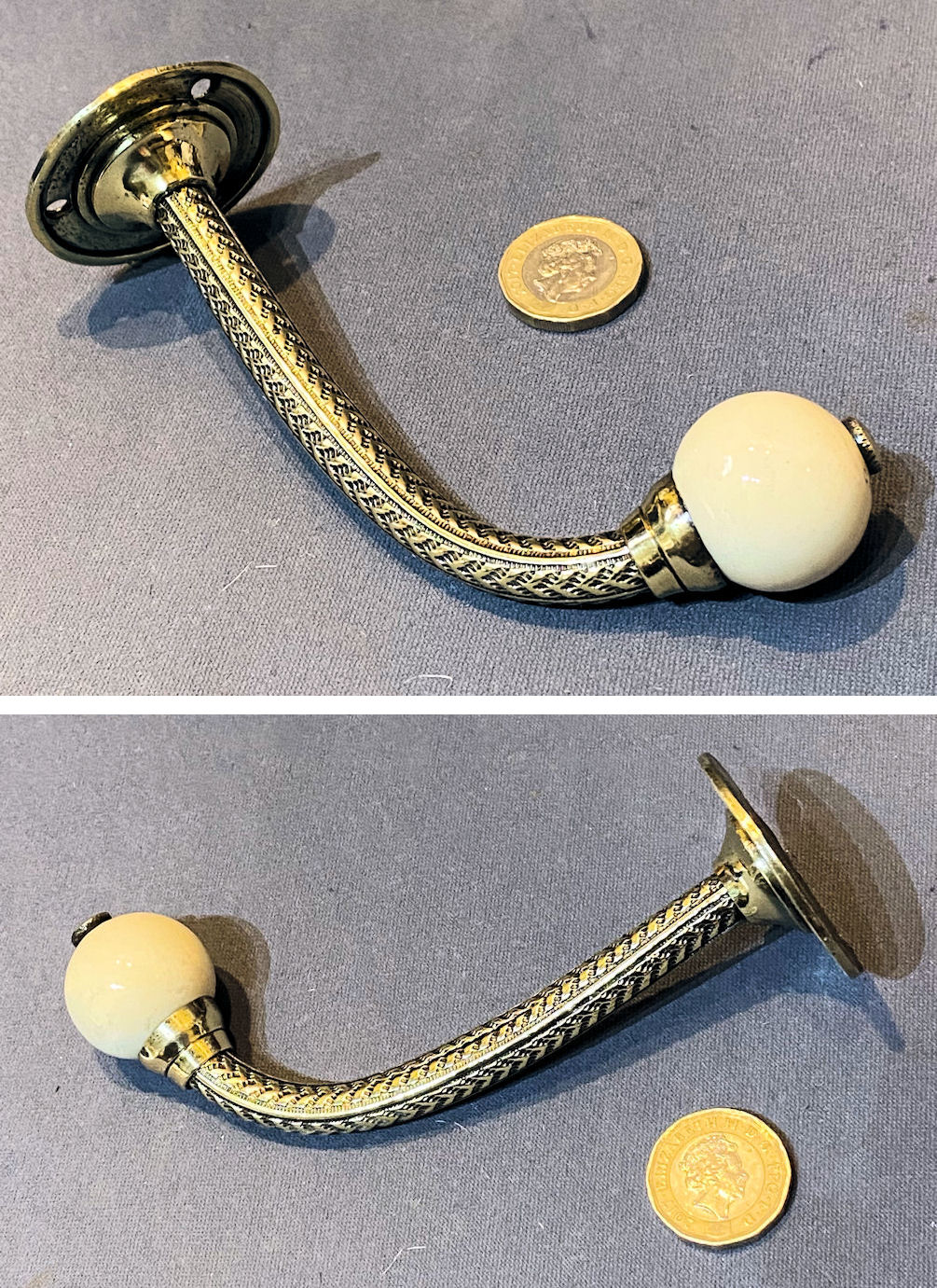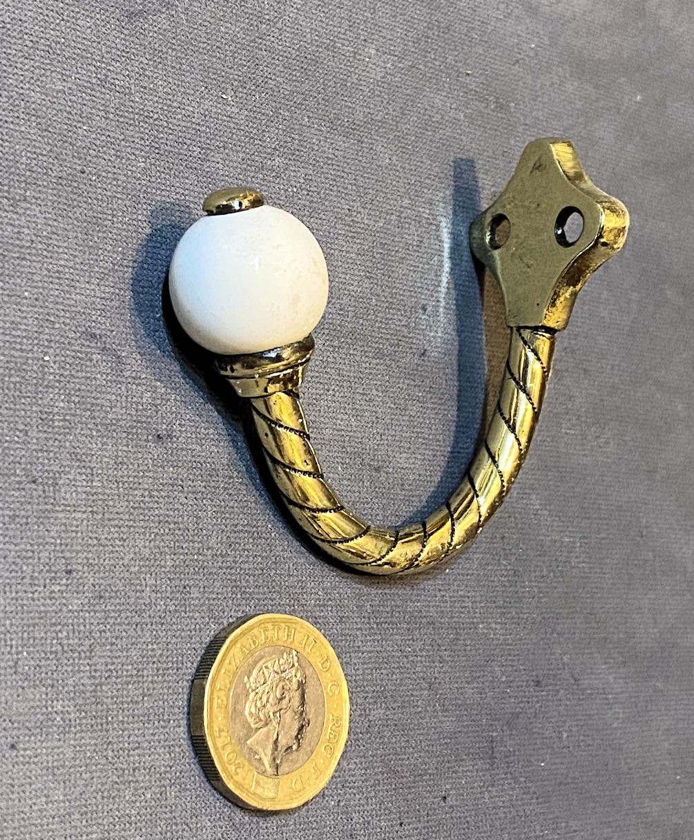 Brass & Ceramic Coat or Hat Peg CH143 Original, quality late 19th century single brass hat or coat peg with a shaped brass backplate with two screw holes for mounting, a rope twist tubular stem and a ceramic white spherical shaped finial. Polished and lacquered, although the lacquer may be removed at no extra cost and complete and in good and working order.