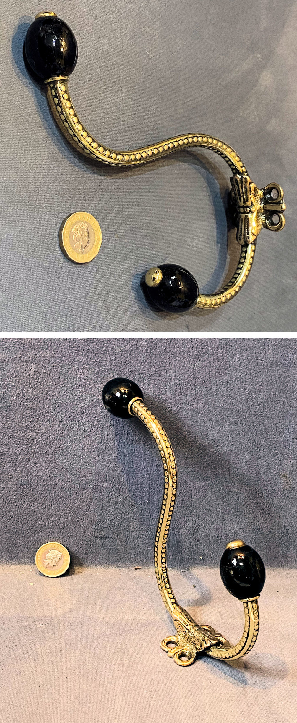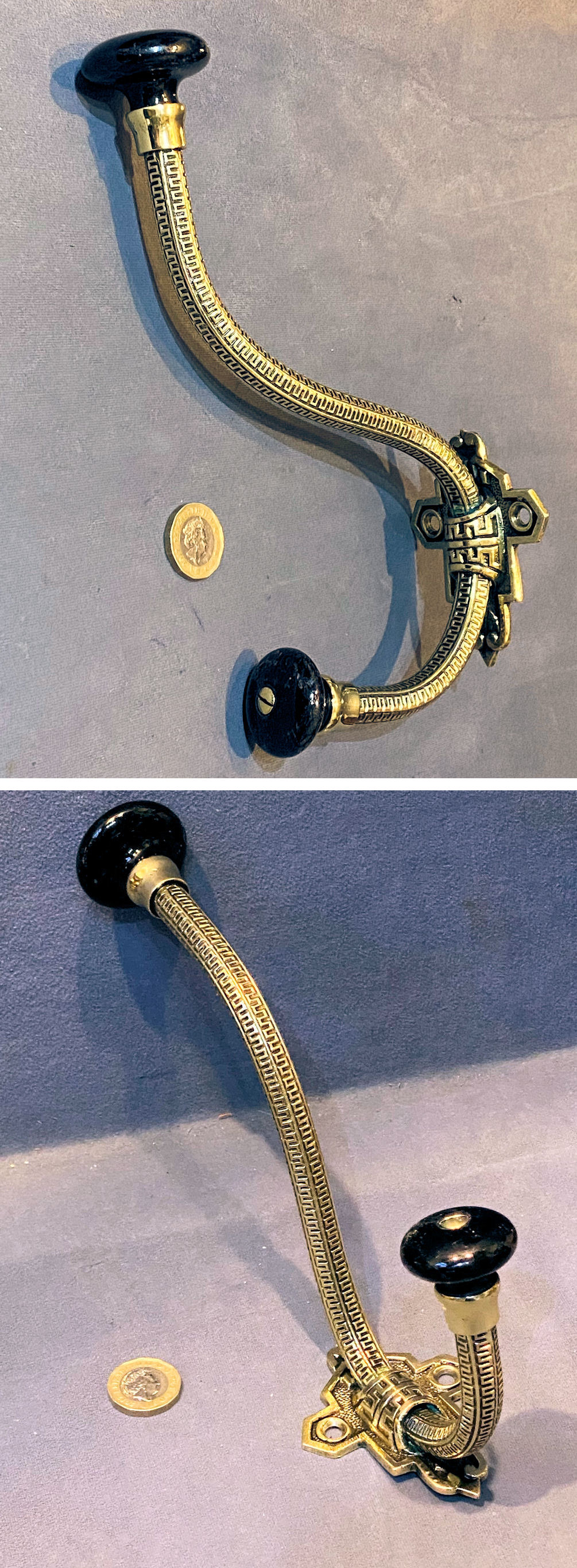 Large Brass & Ceramic Hat & Coat Hook CH140 Original, quality late 19th century larger than average brass coat hook with a "Greek Key" pattern decoration to the tubular stem mounted on a cast brass coat hook with two countersunk screwholes for mounting. The black ceramic finials have a flattened shape. All has been polished and lacquered, although the lacquer may be removed at no extra cost and is complete and in good order.