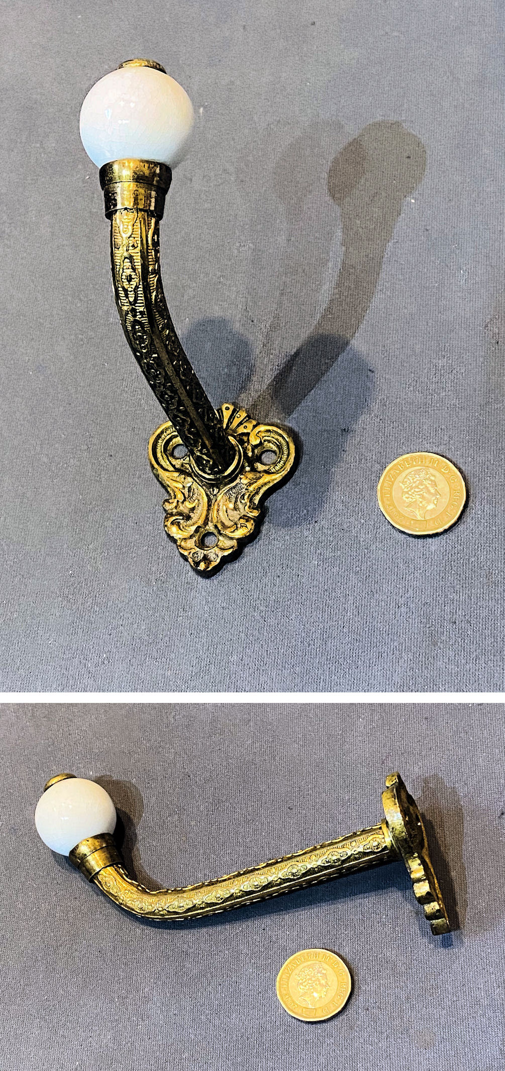 Brass & Ceramic Hat or Coat Hook, 2 available CH73 Original, quality late 19th century brass hat or coat hook in the original matt gilt finish. This example has a two tone rope twisted stem on a cast brass backplate with three countersunk screw holes for mounting and with a spherical shaped white ceramic finial. Complete and in good and working order.