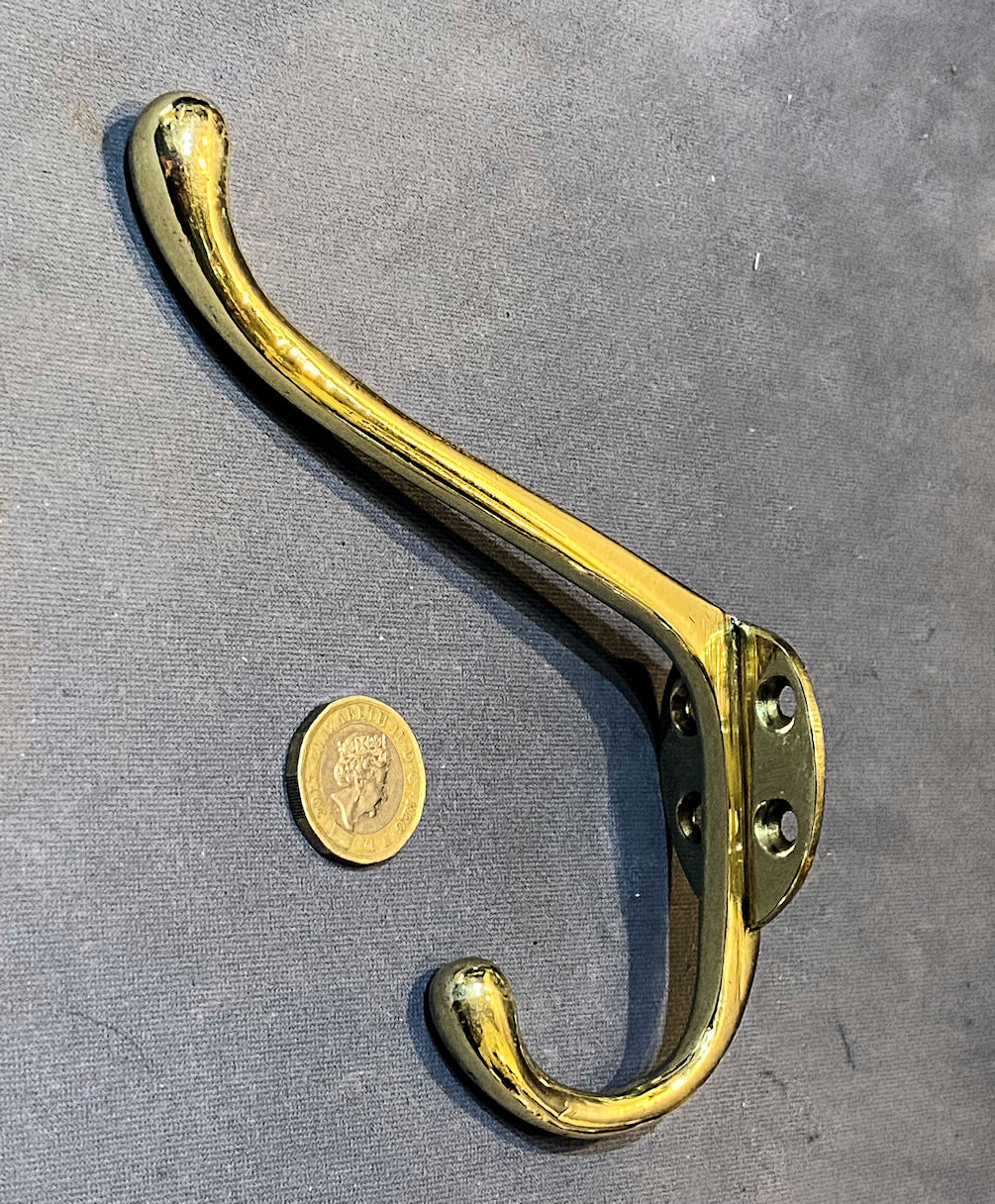 Brass Hat or Coat Peg CH146 Original, quality late 19th century all brass hat or coat peg with a shaped backplate with three countersunk screw holes for mounting. These were often referred to as a surplus hook for the choir boys' surplus. This example has been polished and lacquered, although the lacquer may be removed at no extra cost and is complete and in good and working order.