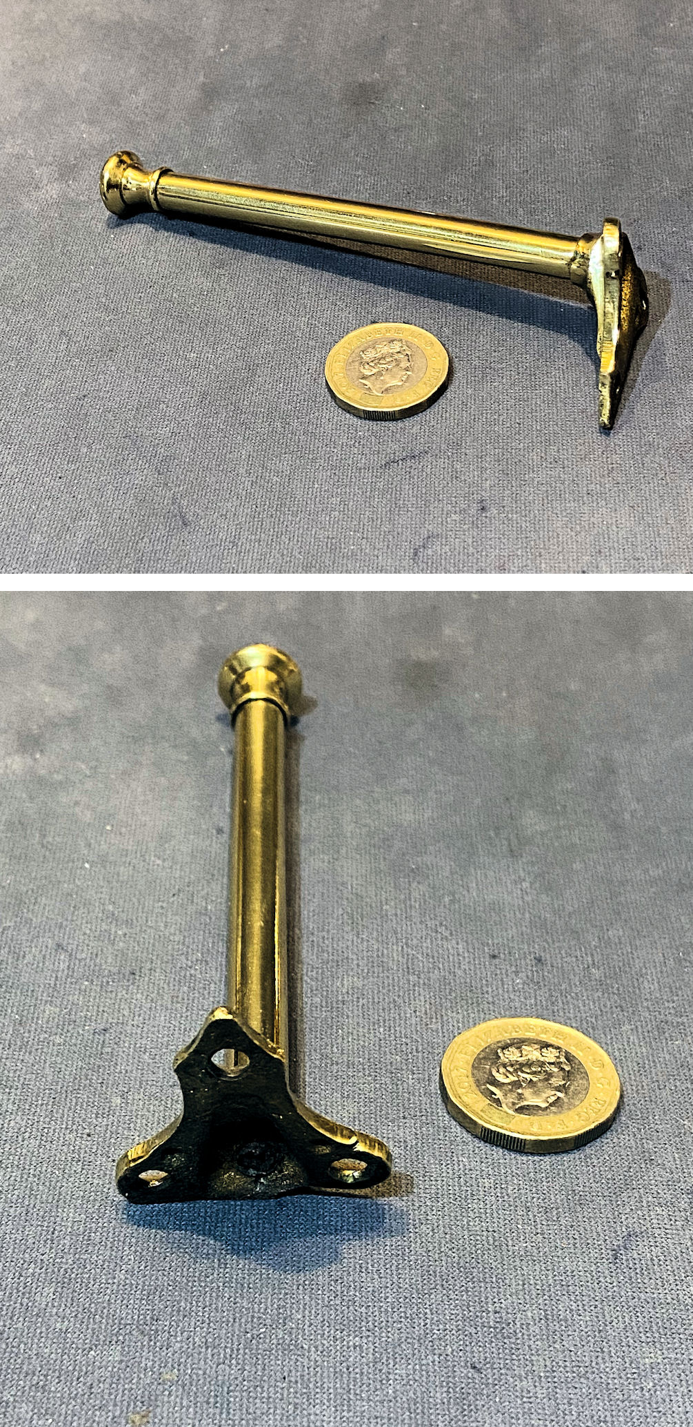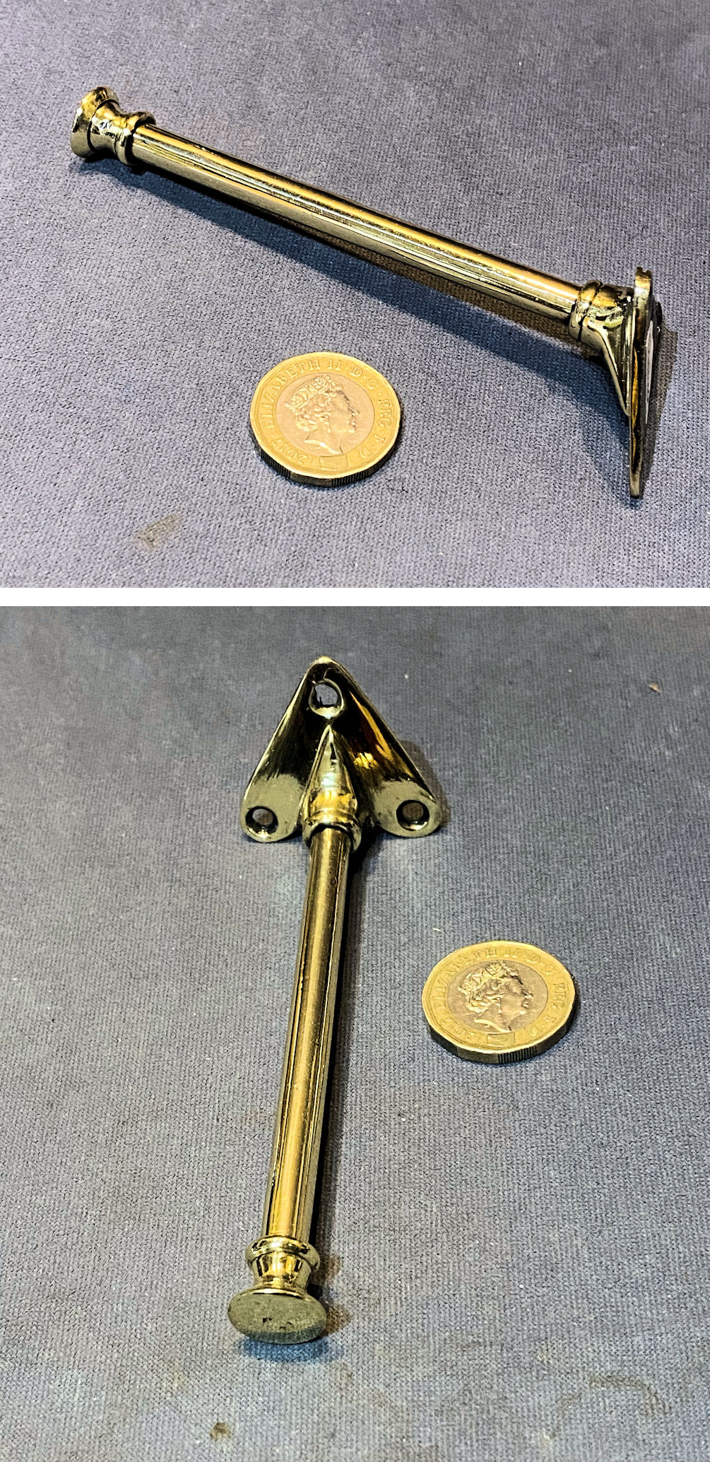 Brass Hat & Coat Hook CH93 Original, quality 1920's cast brass hat and coat hook with an oval backplate with four countersunk screw holes for mounting. Each stem is tapered towards the top and out again to form a finial. Polished and lacquered, although the lacquer may be removed at no extra cost and complete and in good and working order.