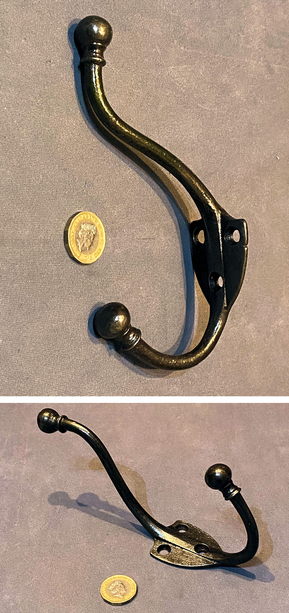 Cast Iron Double Coat / Cup Hook, 3 available CH903 Original, quality late 19th century cast iron double coat hook or cup hook originally from a corner wardrobe. These examples have a 'T' bar shape woodscrew thread and all have been cleaned and lacquered and are complete and in good and working order.